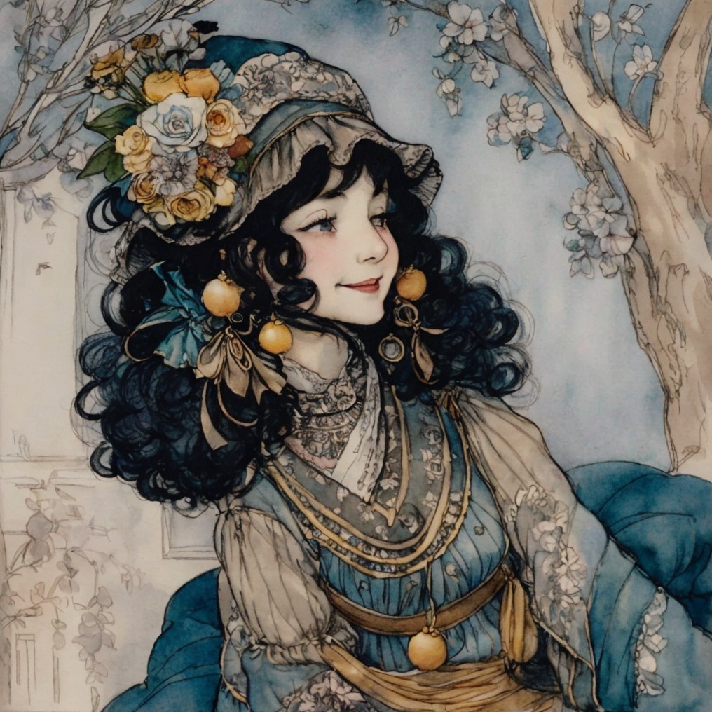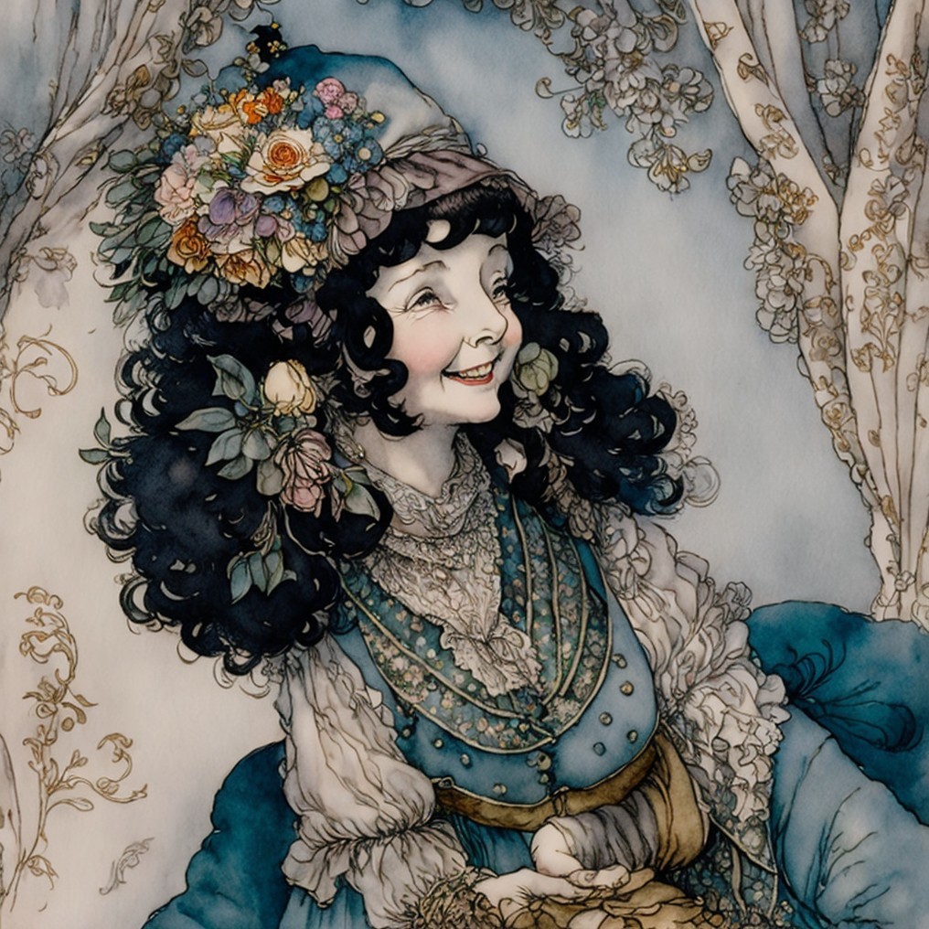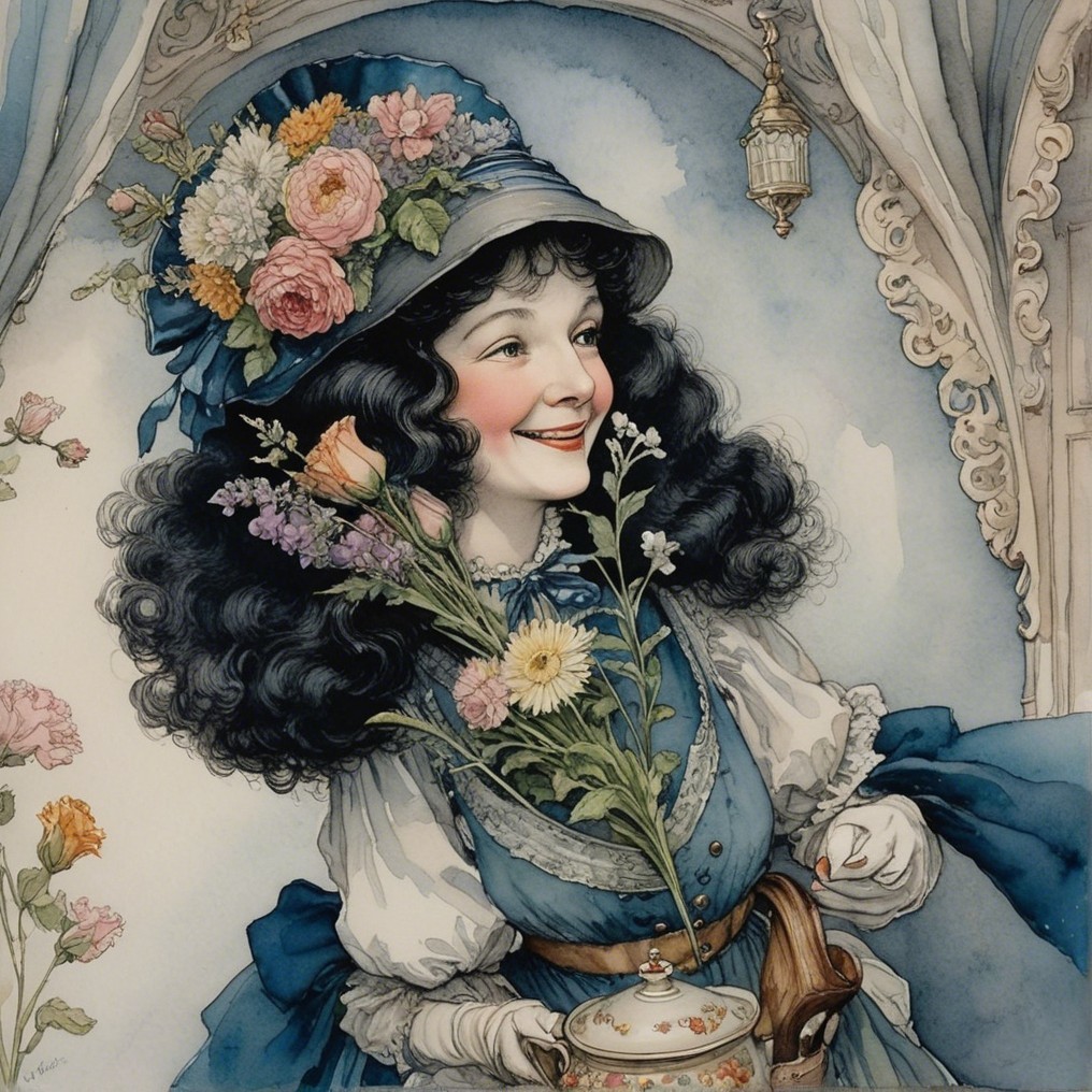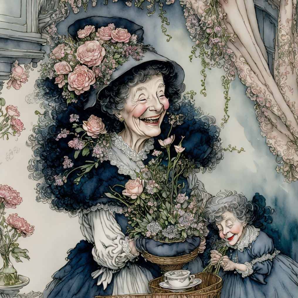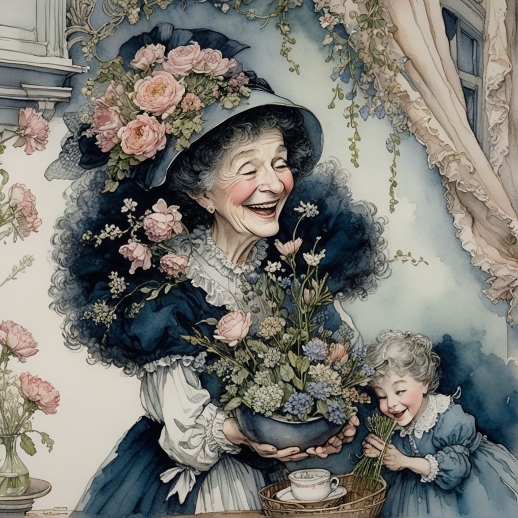 A joyful elderly woman in a flower-adorned hat smiles while holding a bowl of colorful flowers. A young girl beside her playfully tends to another arrangement, capturing a sweet, lively moment.