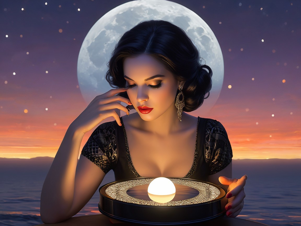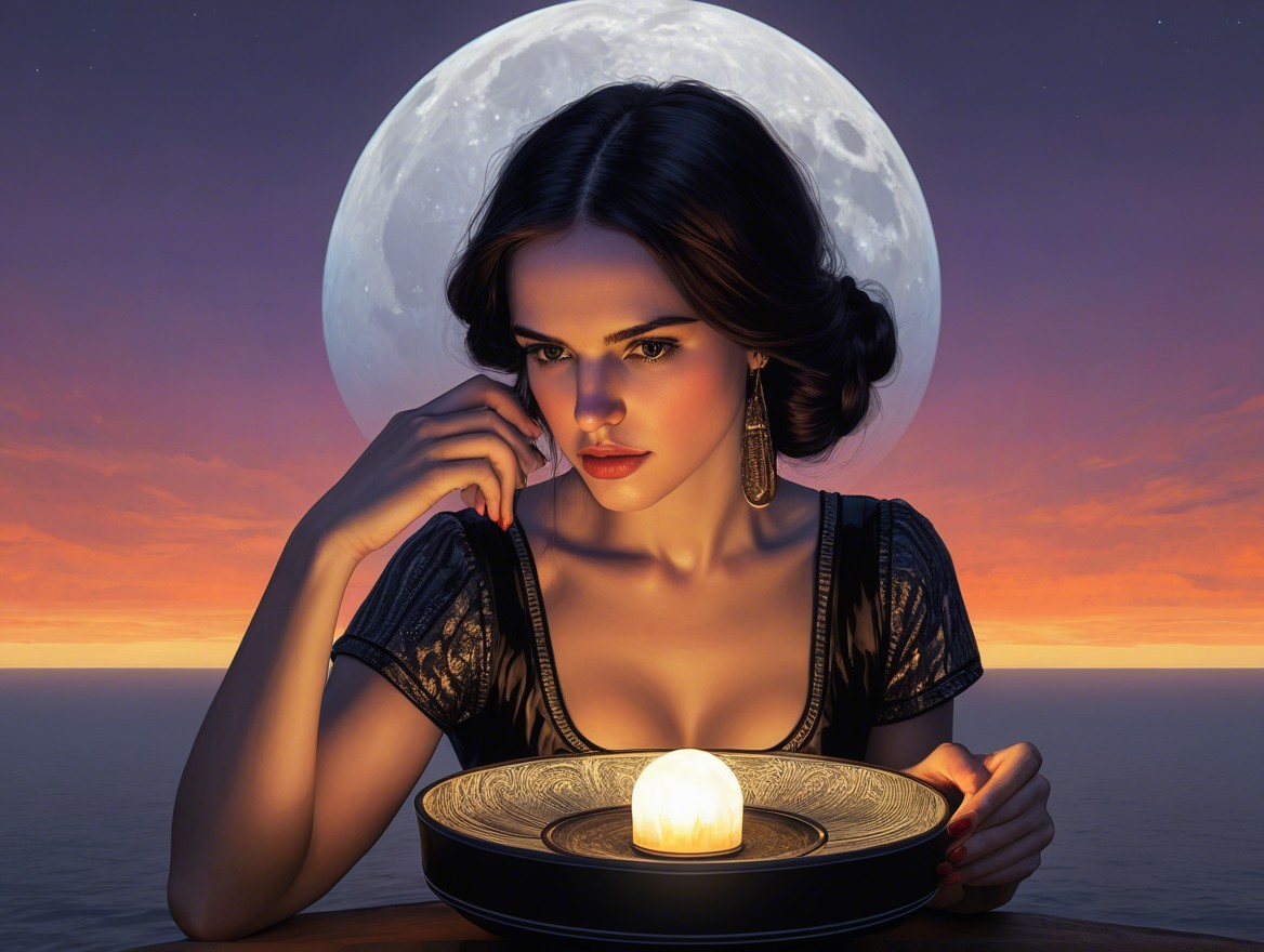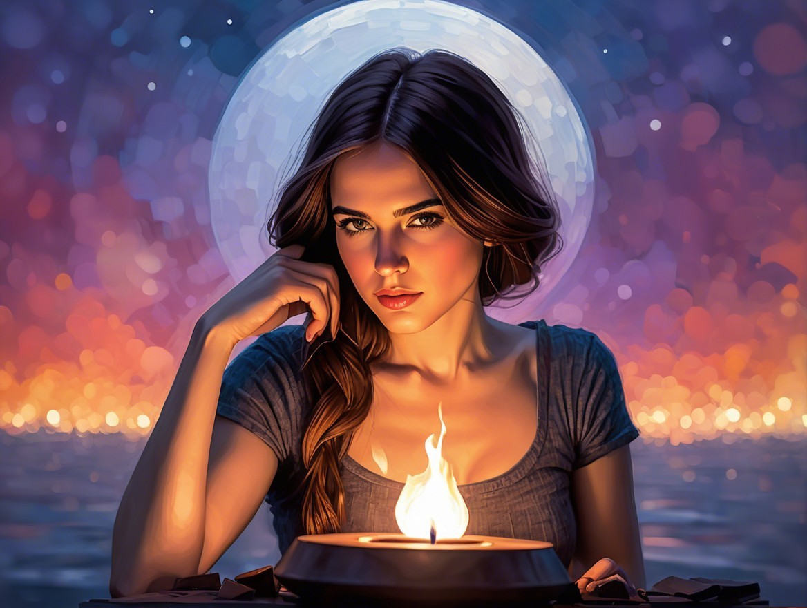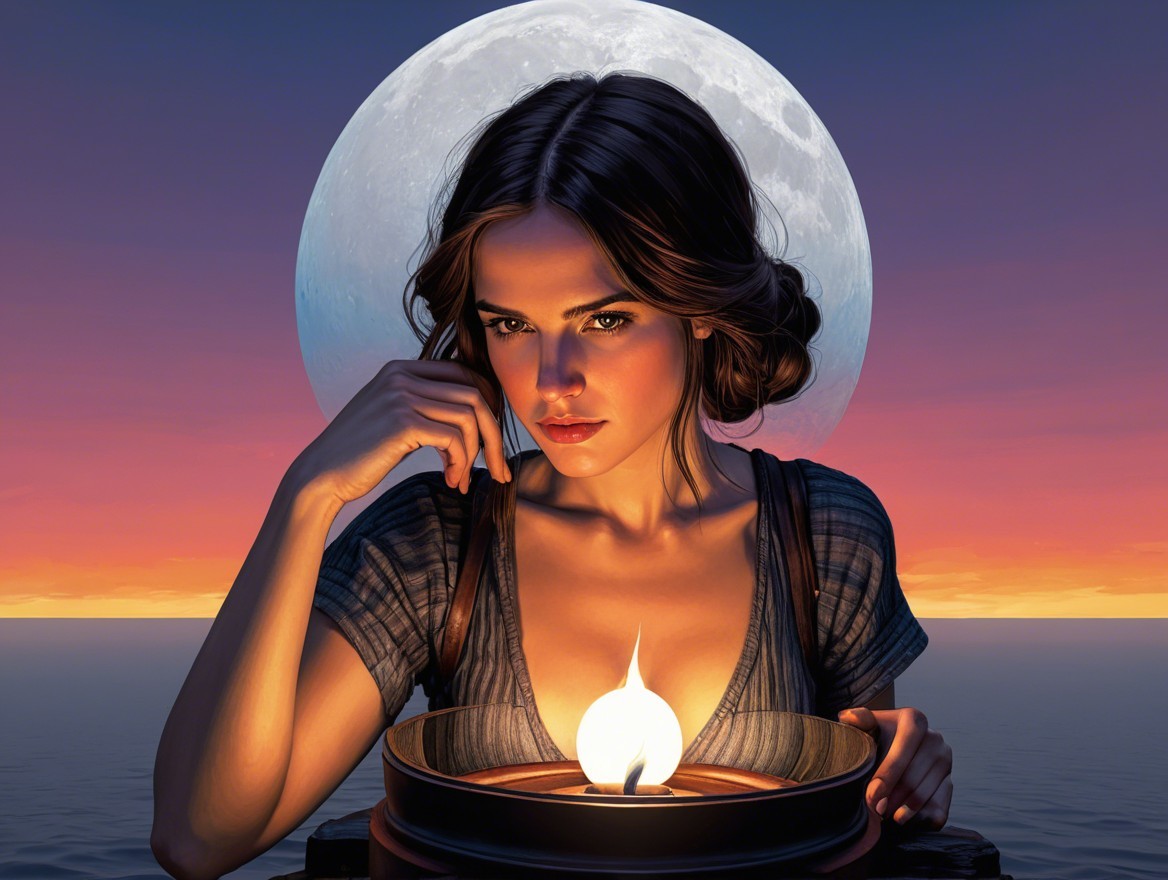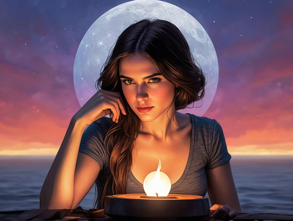 A contemplative young woman gazes intently at a flickering candle, with a large full moon illuminating the twilight sky behind her. The serene ocean reflects the beautiful colors of dusk.