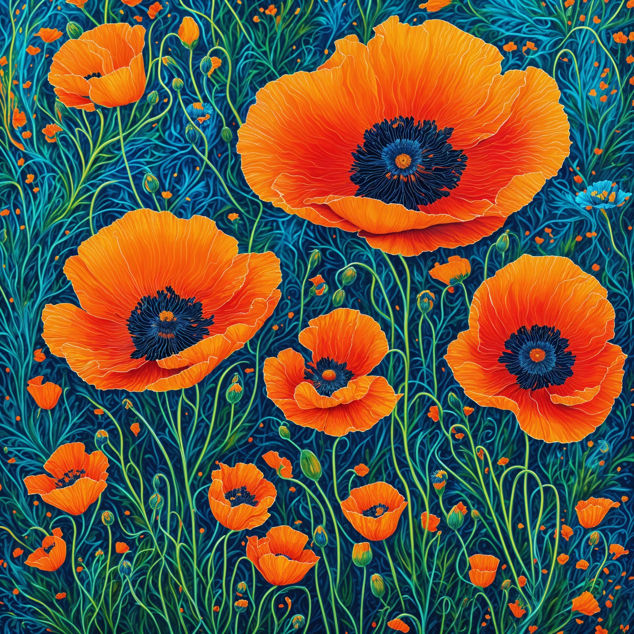 A vibrant arrangement of orange poppies stands against a deep blue background, accented by swirling patterns and a bright sun. The flowers showcase intricate details and lush greenery.
