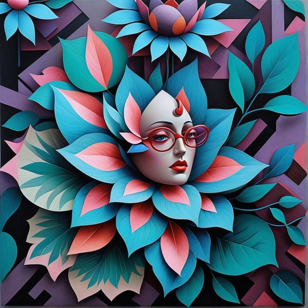 The image features a vibrant, multi-dimensional paper art piece depicting a stylized female face surrounded by large, colorful flowers and leaves, blending geometric shapes with intricate details.