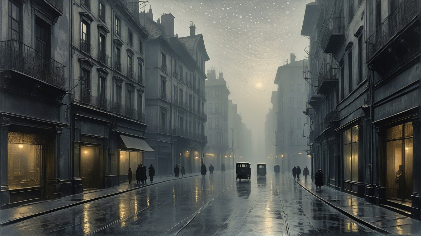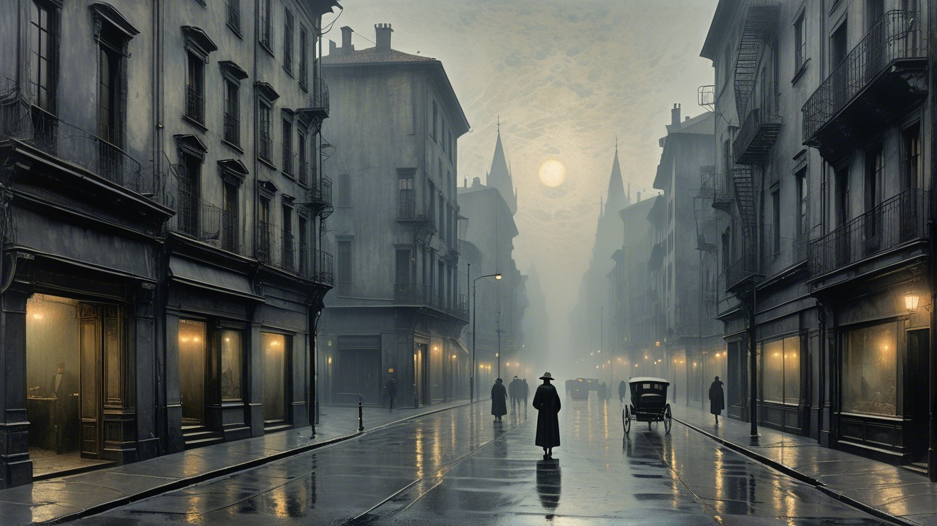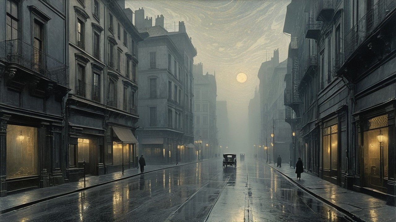 A misty street scene from a bygone era, featuring shadowy figures walking under soft streetlights. Vintage buildings line the wet cobblestone road, with a sunlit sky peeking through the haze.