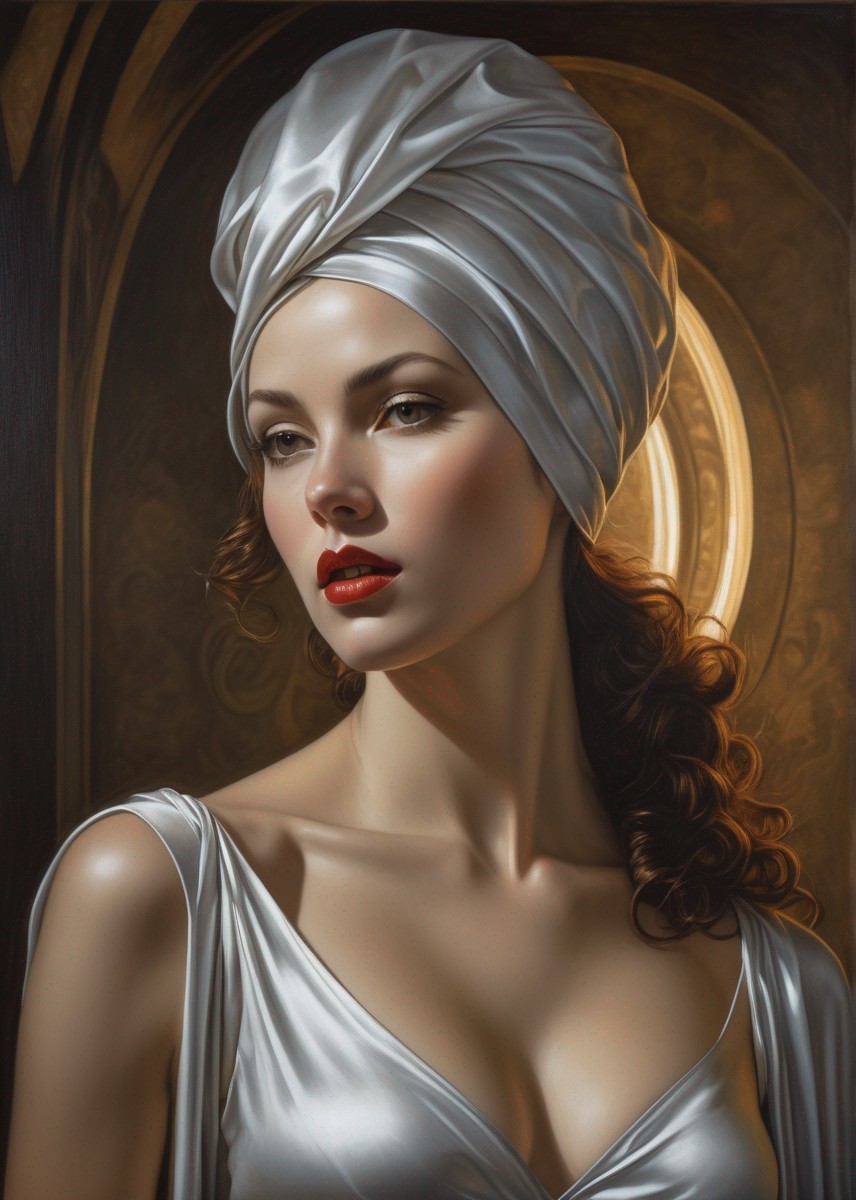 A portrait of a woman with a blue turban, jewel adornment, and dramatic makeup against a patterned background.