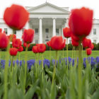 A vibrant garden filled with colorful tulips and blue flowers in the foreground, leading up to a grand white building with columns in the background, creating a picturesque and serene scene.