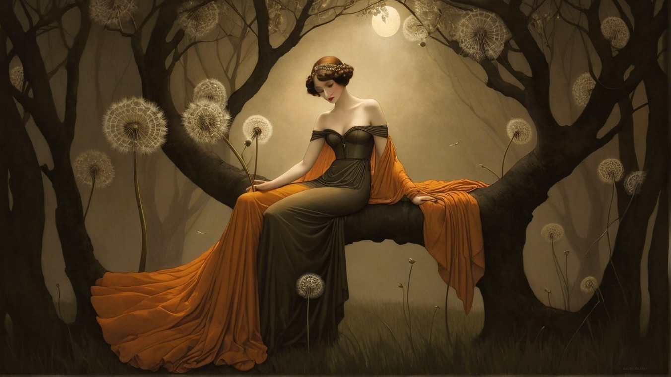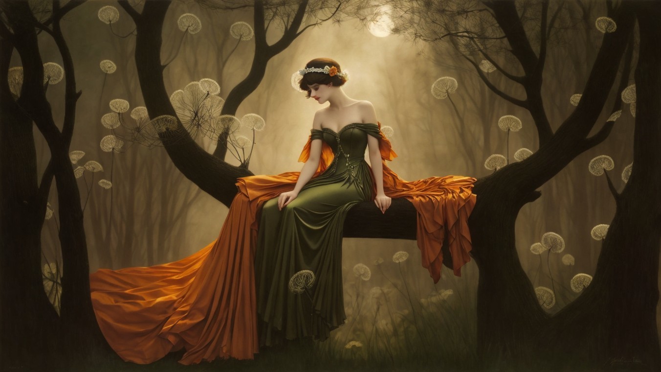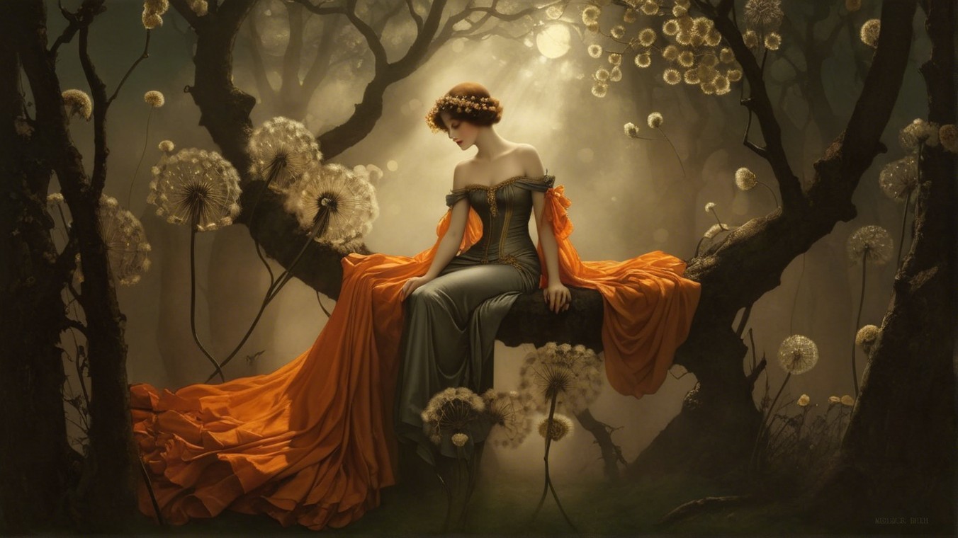 The image features a woman in an elegant orange gown, posed gracefully among dark trees, holding dandelions against a large, luminous moon, exuding a mystical, enchanting atmosphere.