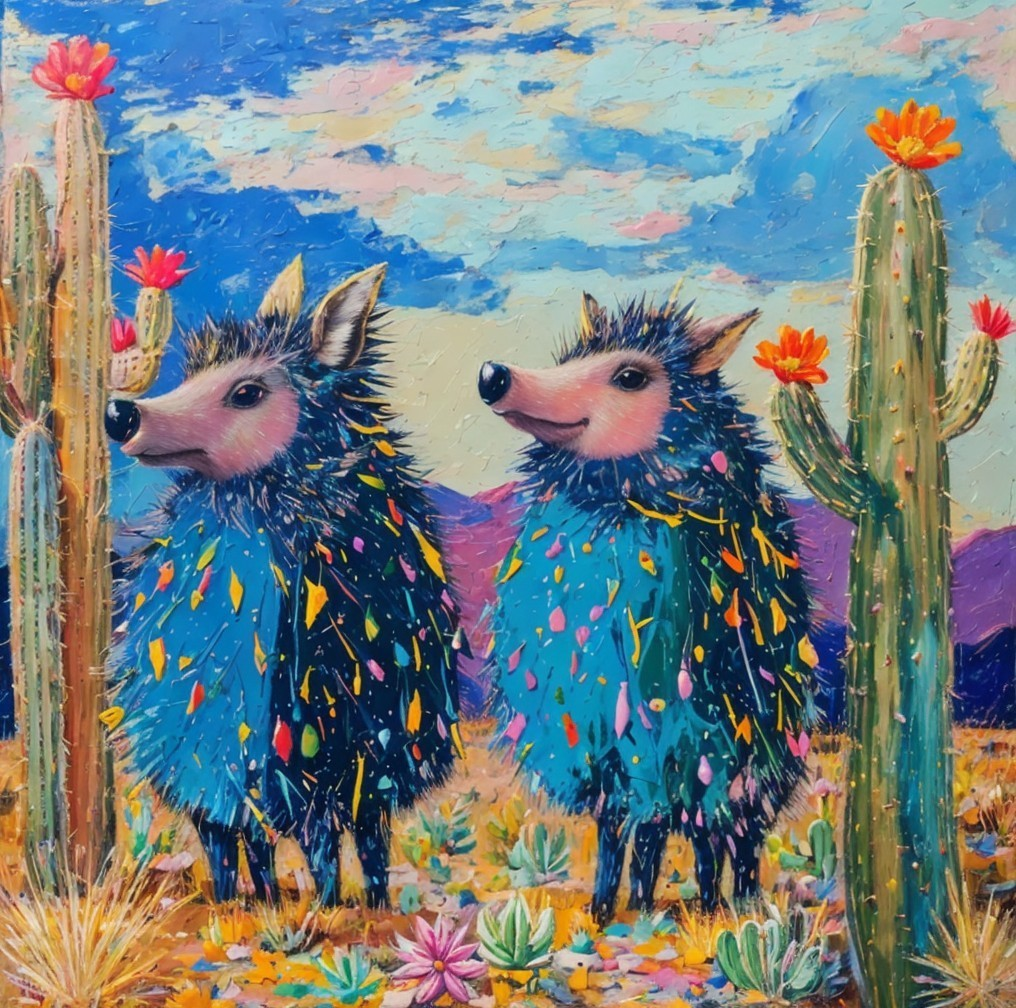 Colorful painting of two stylized hedgehogs among blooming cacti under a vivid sky.