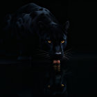 A sleek black panther crouches near a dark, reflective surface, its striking orange eyes gazing intensely ahead. The moody surroundings enhance the mysterious atmosphere of the scene.