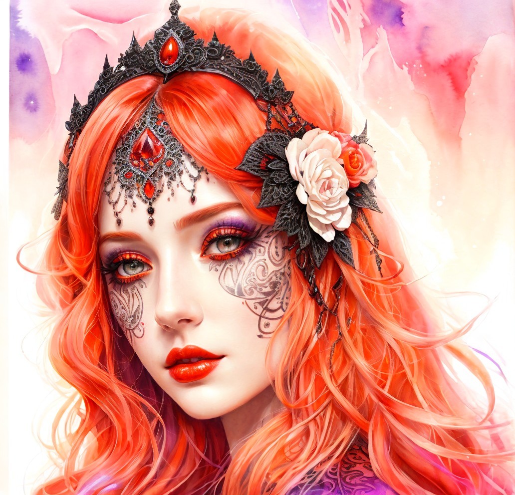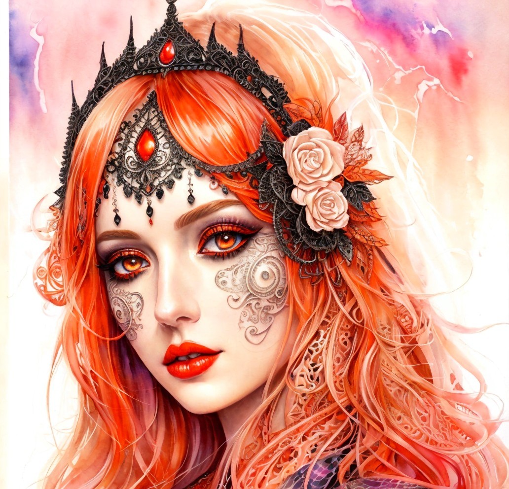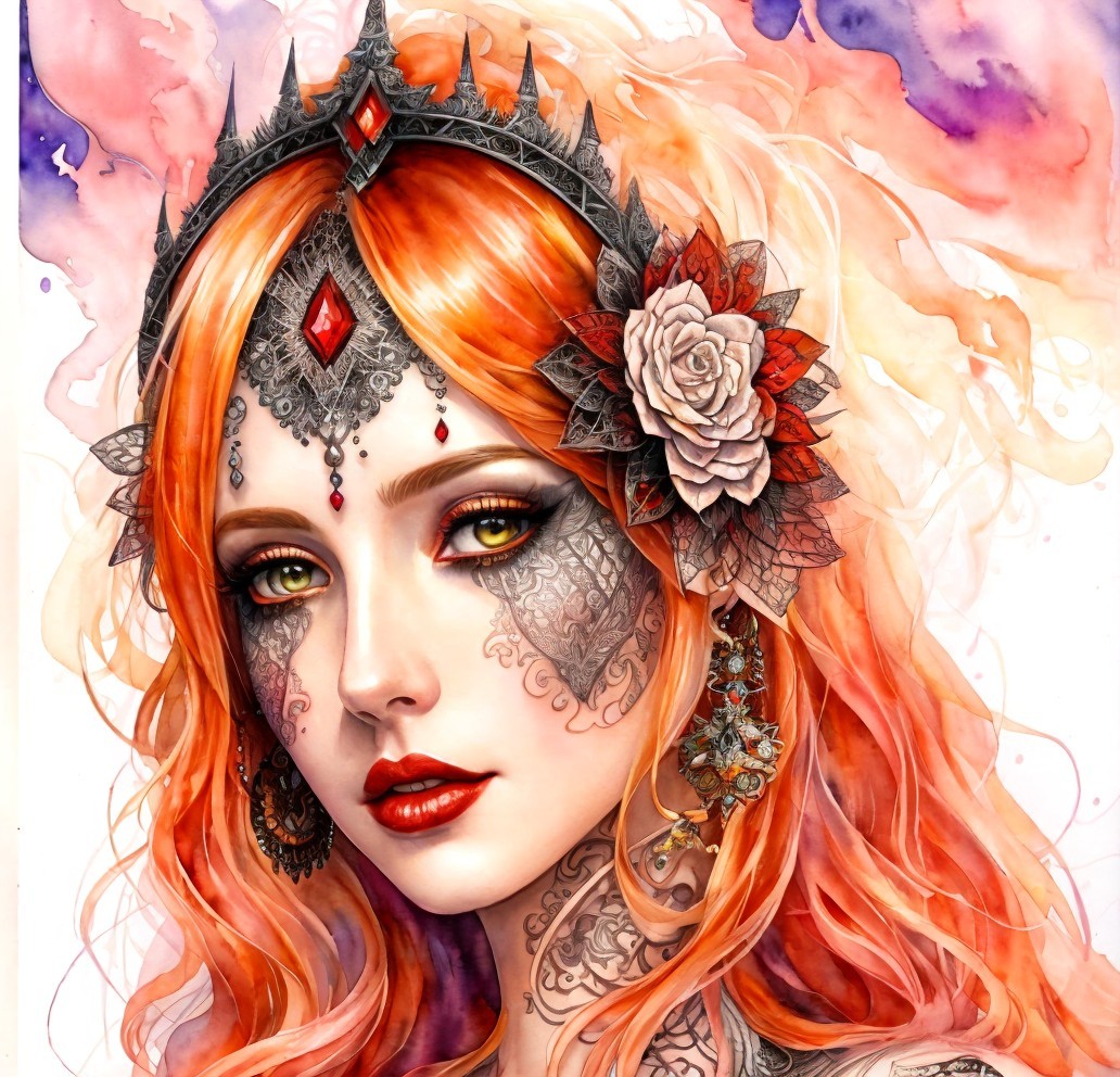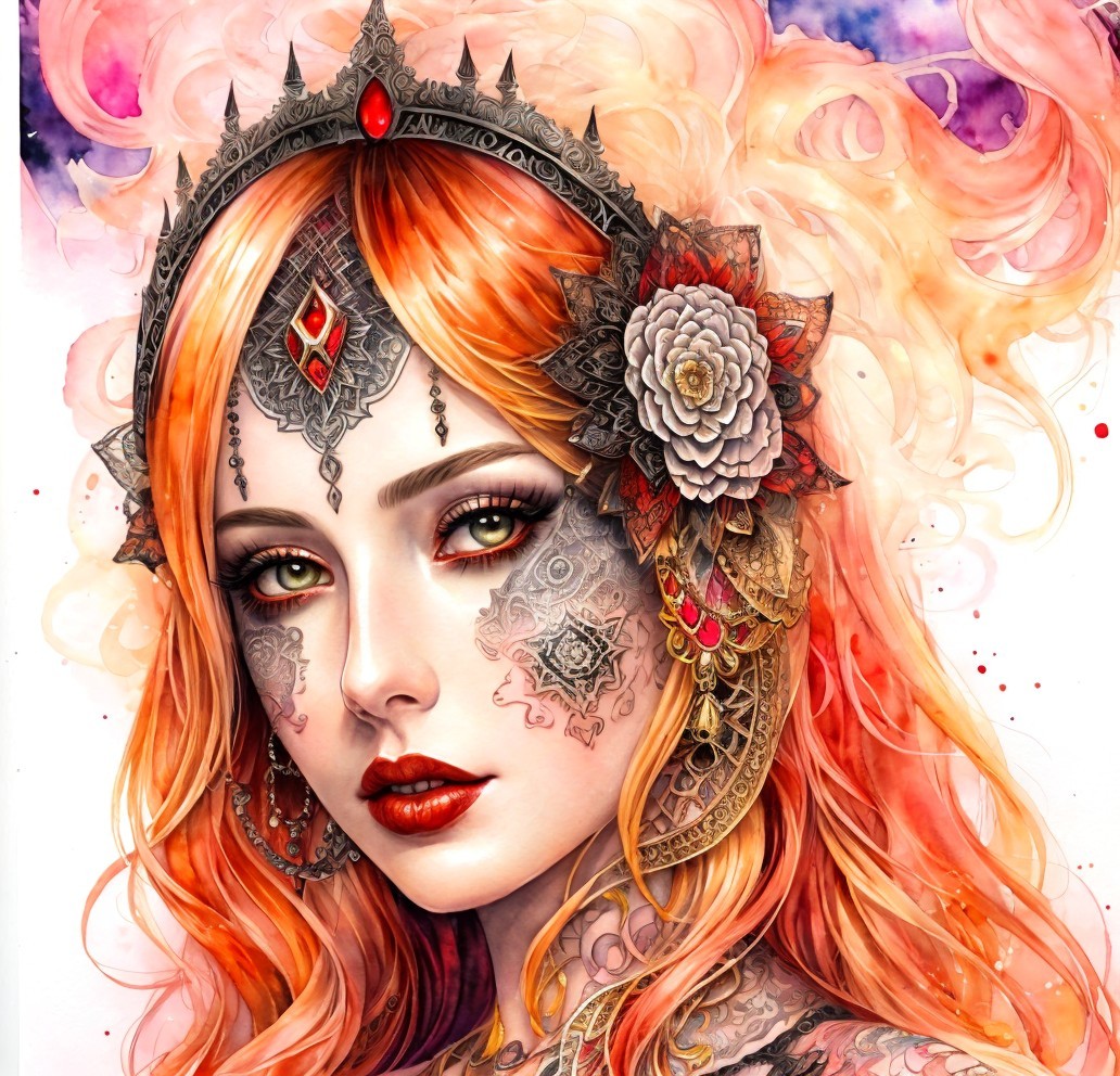 Prompt: Watercolor portrait of a female temptress, ethereal, mystical. She has pale skin,dyed,Watercolor details, inkpunk 1.3, golden ratio,line drawing with filament elements, outline illustration blended with fauvistic fractalization, watercolor and ink style, comic book art 1.7, intricately patterned with black and red zentangle lines that are tattooed . fantasy art-inspired, fabric textures in watercolor and ink, acetate, grunge, coherent, octane render illustration, Novelty architecture, Pencil sketch, Vintage, ominous, pen and ink, dreamy dystopian melancholic, hallucinatory, plasticity 1.3, fantasycore artwork, watercolor paint on silk, geometric patterns, Luxurious silk texture, pale, watercolor blend, ink splatter merged with gouache, folded paper style, concept art, fine line drawing executed with calligraphic precision, textured with pastel colors, copper, reddish-brown, crimson and pink threads, very defined lines in the style of Cameron Gray and Brendan Monroe, detailed ink painting, vibrant colours, fabric paper texture, paint splashes. Rich and varied textures, 3D brushwork, unusual and precise lines, harmonious,textured,, inspired by Georgia o'keffee,traumacore 1.2, beautiful composition 1.9, coffinwood 1.7, brightness 1.4, divisionism, radiance, cottagegore 1.7, uhd, hdr, octane render illustration,