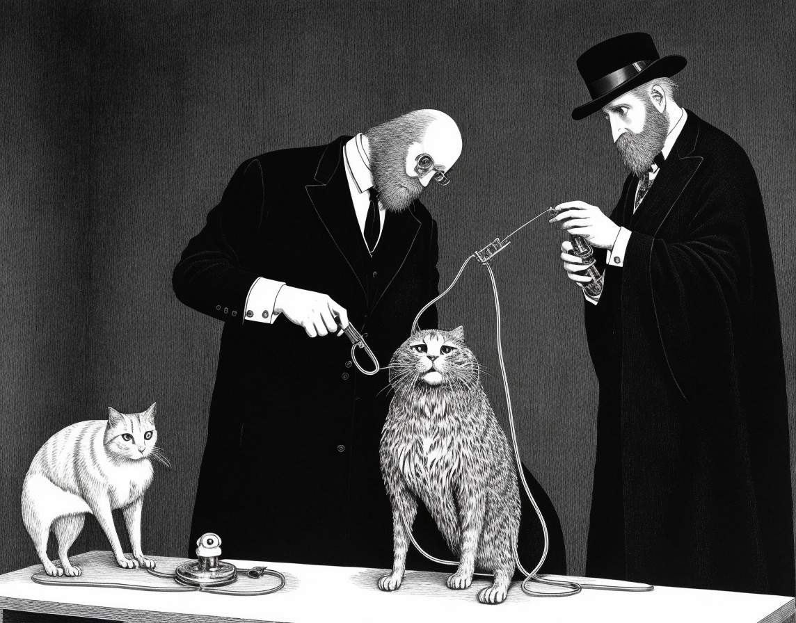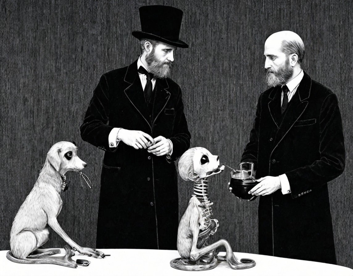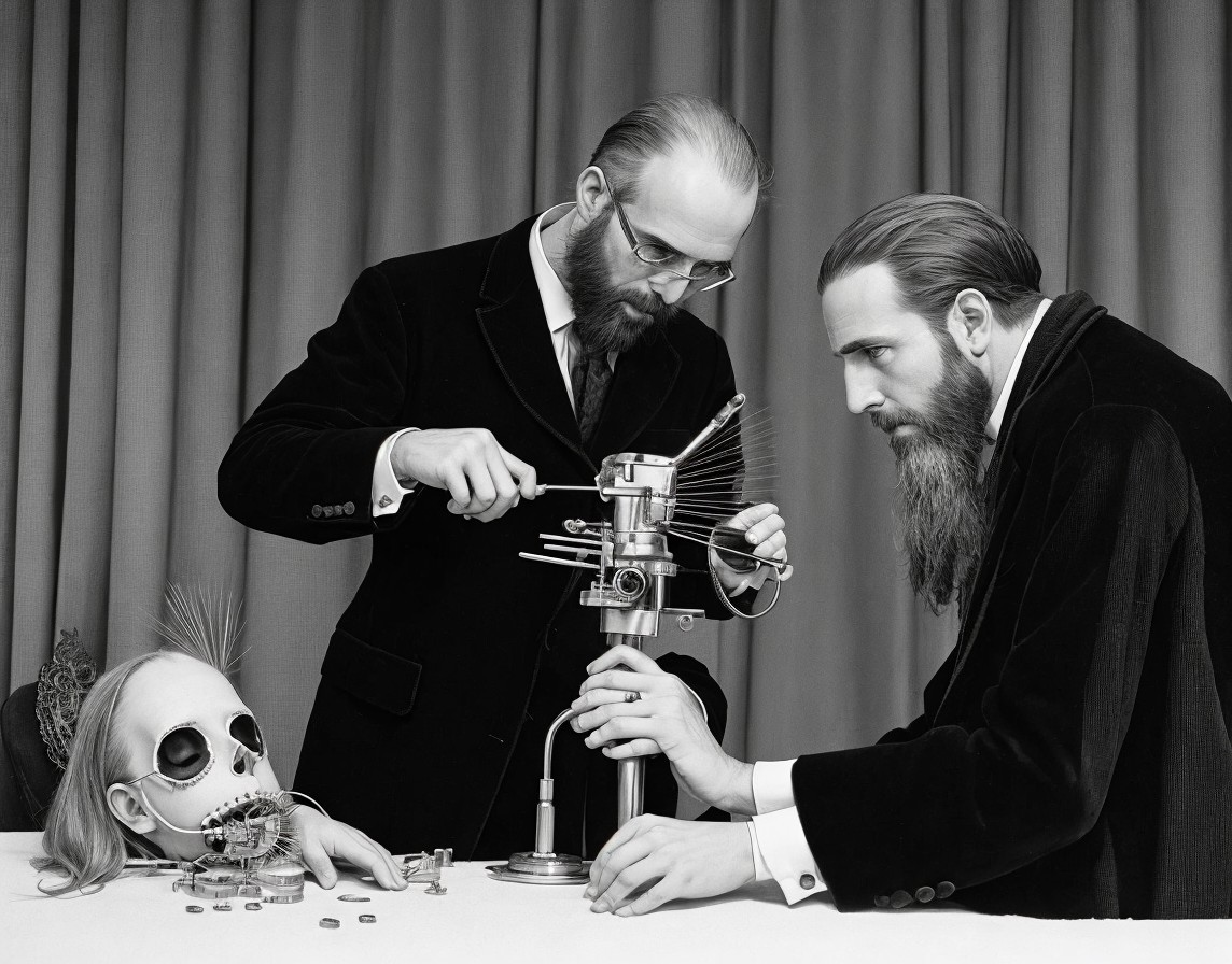 Three individuals with robotic companions examine an intricate sculpture combining mechanical and human features against a black background.