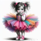 A cute baby girl in a colorful, fluffy dress with vibrant layers is crawling playfully. She has pigtails adorned with flowers and a curious expression, surrounded by a bright, cheerful vibe.