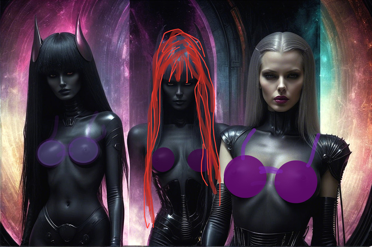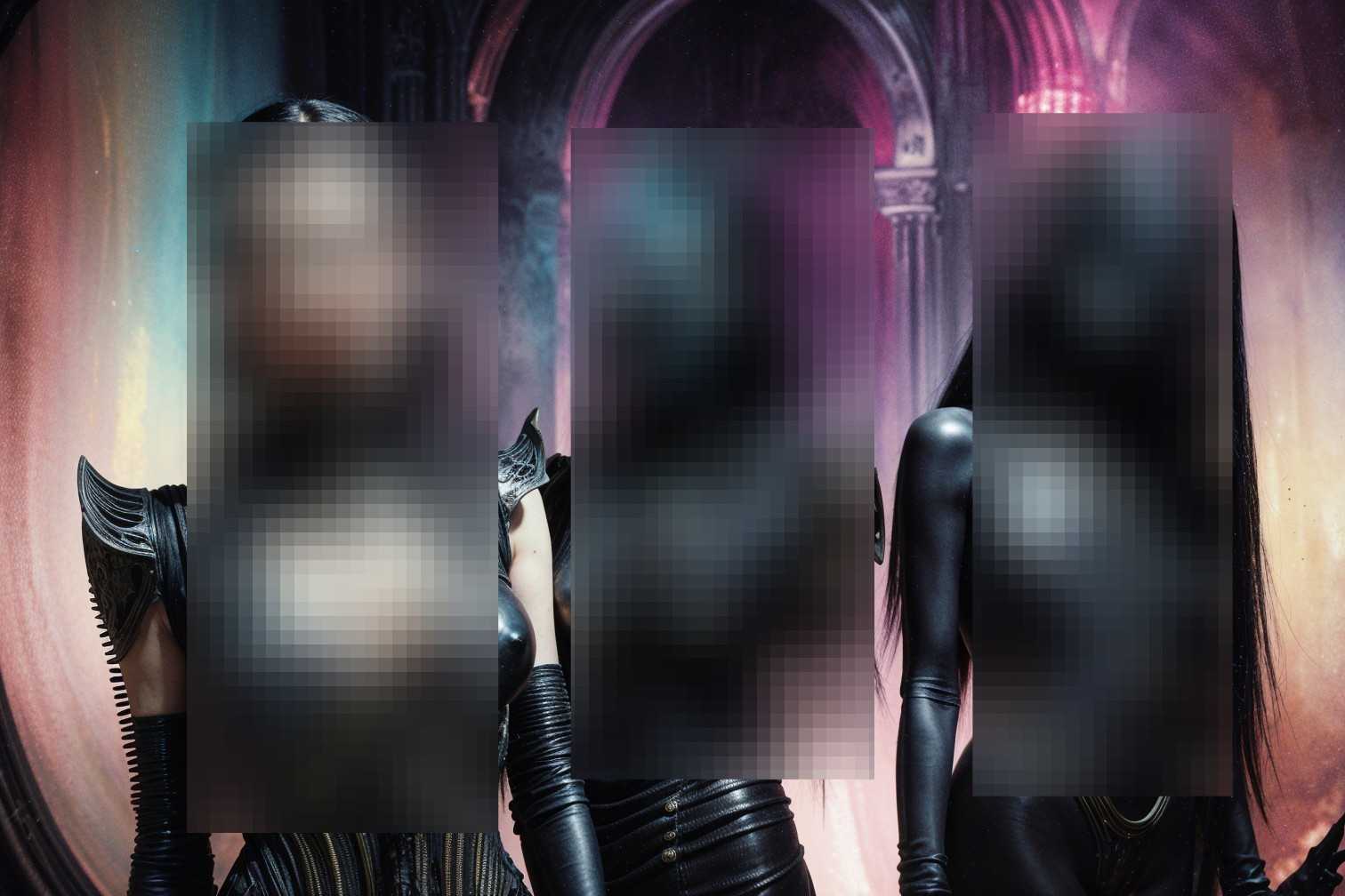 Three stylized figures with striking hairstyles and elaborate, dark outfits featuring glowing purple accents. Their expressions are intense, set against a colorful, mystic background.