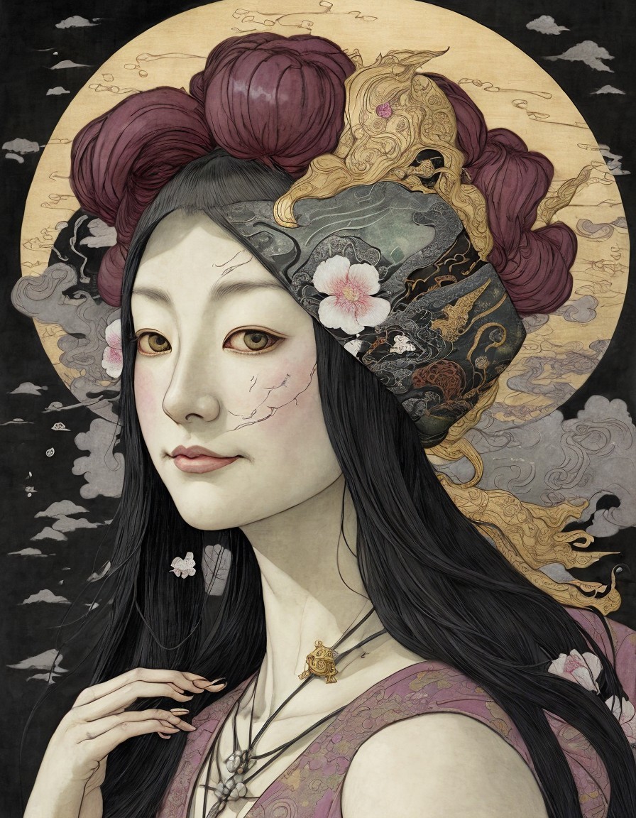 Beautiful enchantress. Medieval Japanese Artists Sumi-e Style . Mysterious, ethereal, alluring . Enigmatic smile. Beautiful clouds at dawn. , andrew wyeth, edward gorey, hope gangloff, spare style, liminal