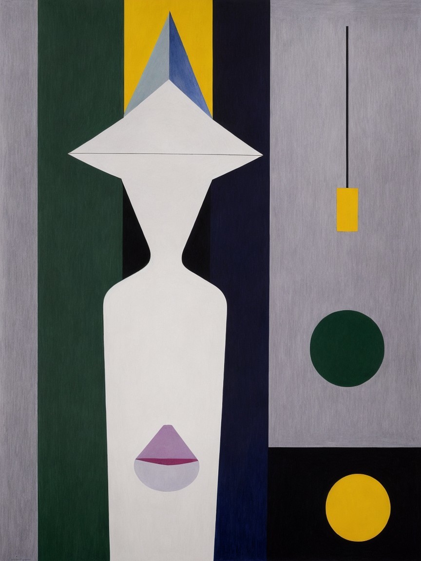 The image features a modern, abstract composition with two stylized faces, a prominent green hat, and geometric shapes in contrasting colors, creating a striking visual balance.