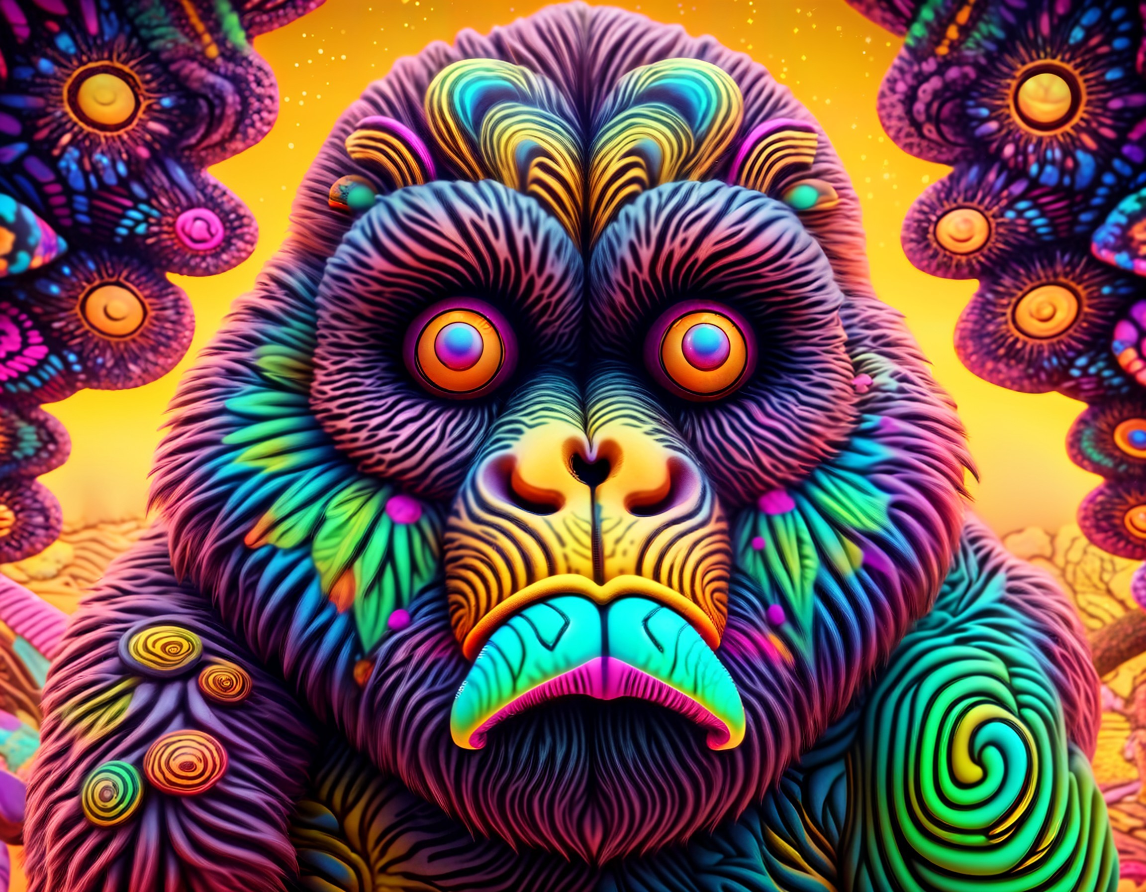 A vibrant, psychedelic image of a multicolored monkey with intricate patterns and neon, fractal-like backgrounds.