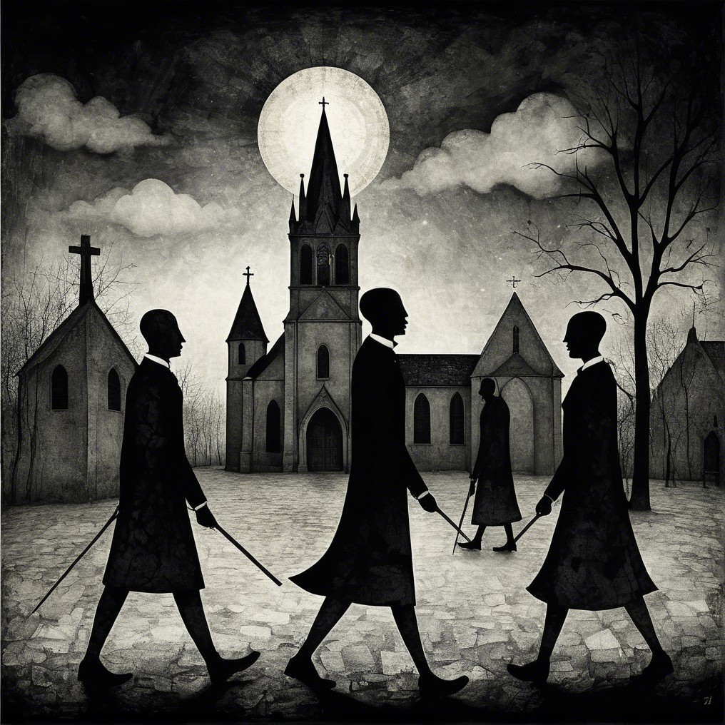 A haunting, monochromatic scene depicts three silhouetted figures walking through a dark, eerie landscape, with a church and moon in the background, evoking a sense of mystery and foreboding.