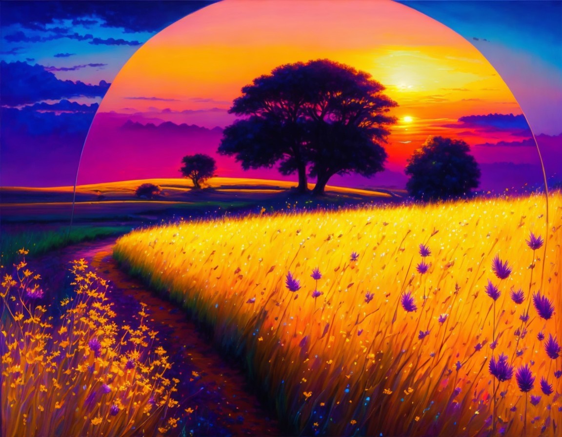 A vibrant sunset casts warm hues over a golden field, with flowers blooming along a winding path. Silhouetted trees stand against a colorful sky, creating a serene, dreamlike landscape.