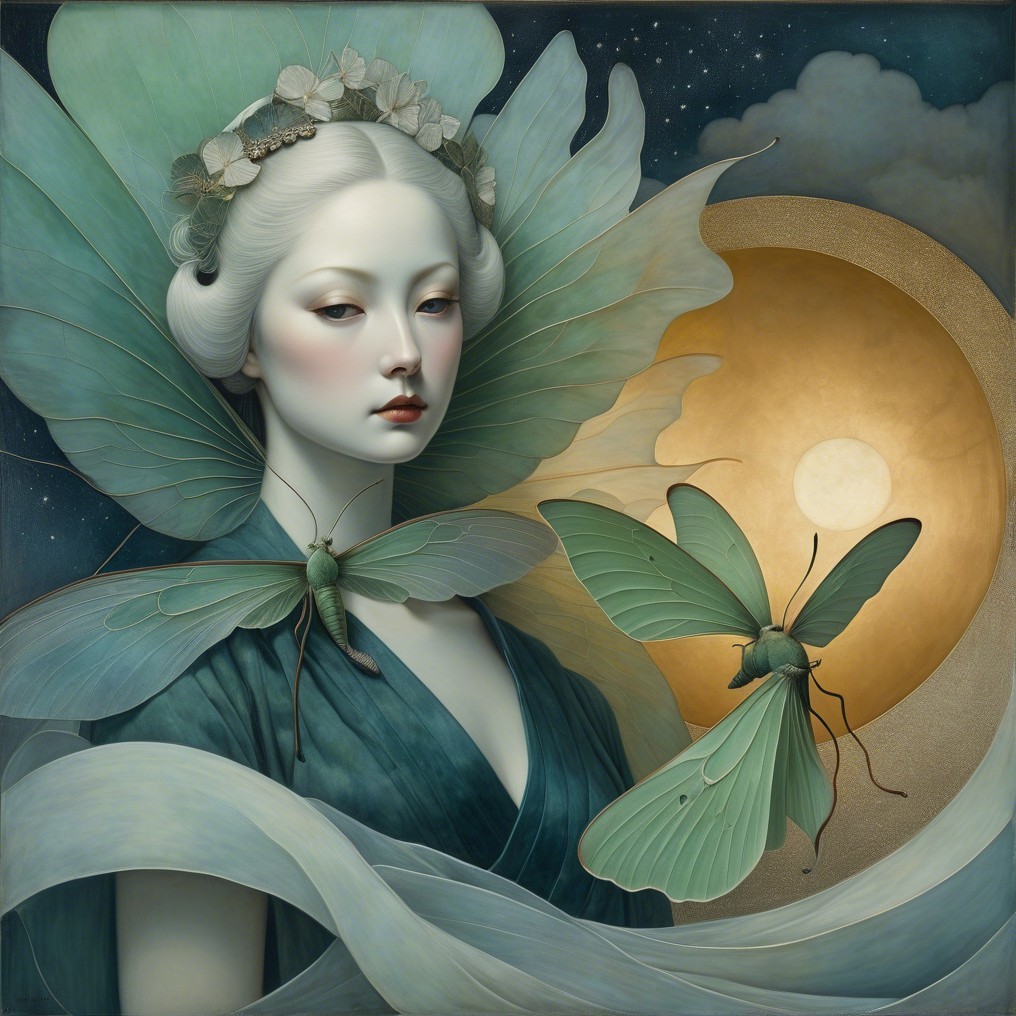 Luna moth. Surreal dream in the style of Watanabe Shōtei, nostalgia, glory, Mercury Glass patina, light and gossamer haze, topographic lines, Art Brut, moody, somber, desaturated colors. In the style of John Rogers cox . This artwork amalgamates the artistic styles of Michael Parkes,