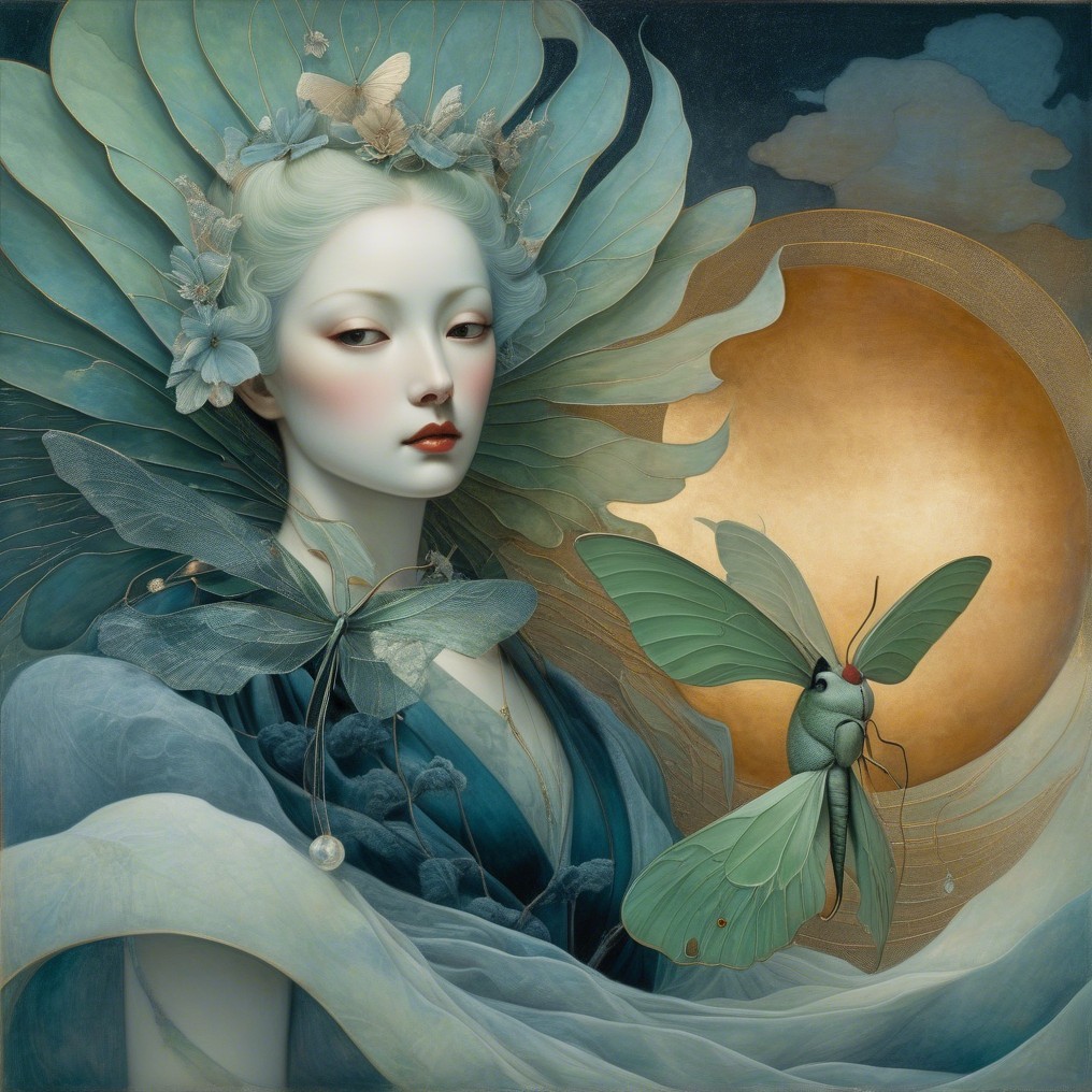 Prompt: "Luna moth. Surreal dream in the style of Watanabe Shōtei, nostalgia, glory, Mercury Glass patina, light and gossamer haze, topographic lines, Art Brut, moody, somber, desaturated colors. In the style of John Rogers cox . This artwork amalgamates the artistic styles of Michael Parkes,