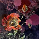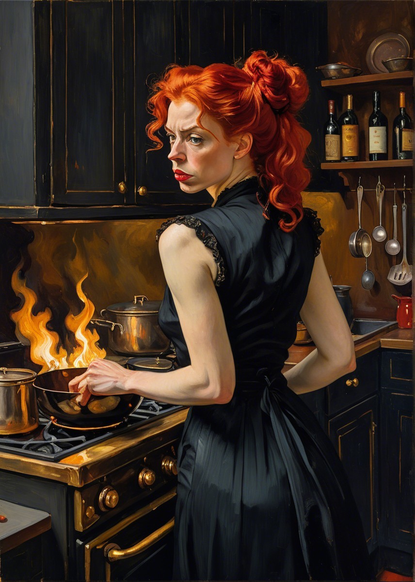 + Prompt:Create an oil painting in the combined styles of Van Gogh, Egon Schiele, and Toulouse Lautrec depicting one angry, distracted looking woman with red hair, standing in her kitchen, in a black dress with gold filigree. She holds a glass of red wine. On the stove there is a frying pan with its contents on fire. The background should be dark, with moody light, set against a wall with peeling paint.