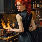 Prompt: Create an oil painting in the combined styles of Van Gogh, Egon Schiele, and Toulouse Lautrec depicting one angry, distracted looking woman with red hair, standing in her kitchen, in a black dress with gold filigree. She holds a glass of red wine. On the stove there is a frying pan with its contents on fire. The background should be dark, with moody light, set against a wall with peeling paint.