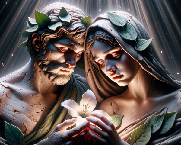 Prompt: Primer plano realista de Adán y Eva al salir del Paraíso; mirar al horizonte con expresiones de dolor y angustia, pero una luz esperanzadora los rodea; elementos divinos como rayos de luz cálida bañándolos, naturaleza imperfecta con hojas y flores alrededor, tonos cálidos y suaves que sugieren fe y propósito. El cielo con luz suave como señal de esperanza y reconexión con lo Divino.