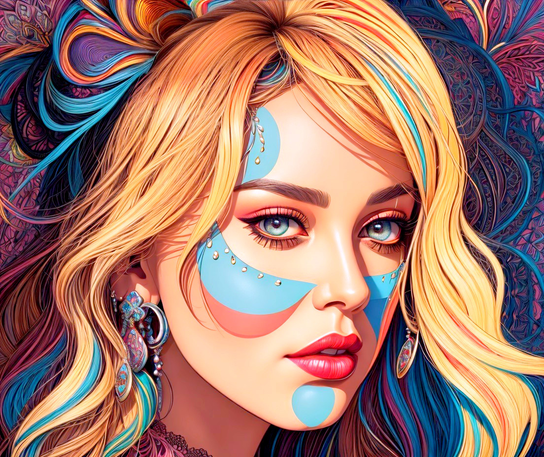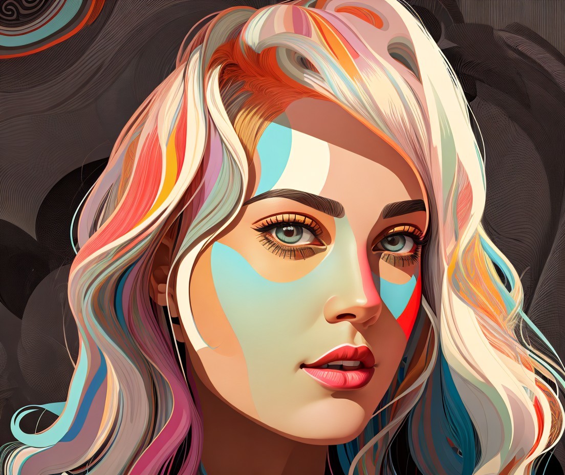 Prompt: "Portraiture fatasy style, tints of 1970s advertising art, illustrative stylization,detailed eyes with graphic emphasis, high coloring, brushed textures, colorful line patterns, headshot, abstract modern designs, american modernism, beautiful Illustration, layered geometrical vector art, vector 9:5,shadow mapping 1.3, 3d effects 1.8, triadic colour scheme blue grey pink, acid spill, embossed strokes, inkpunk 1.8, brightness 1.4, ambient occlusion 1.5, dynamic lighting 1.7, hues, iridescent fractal accents"