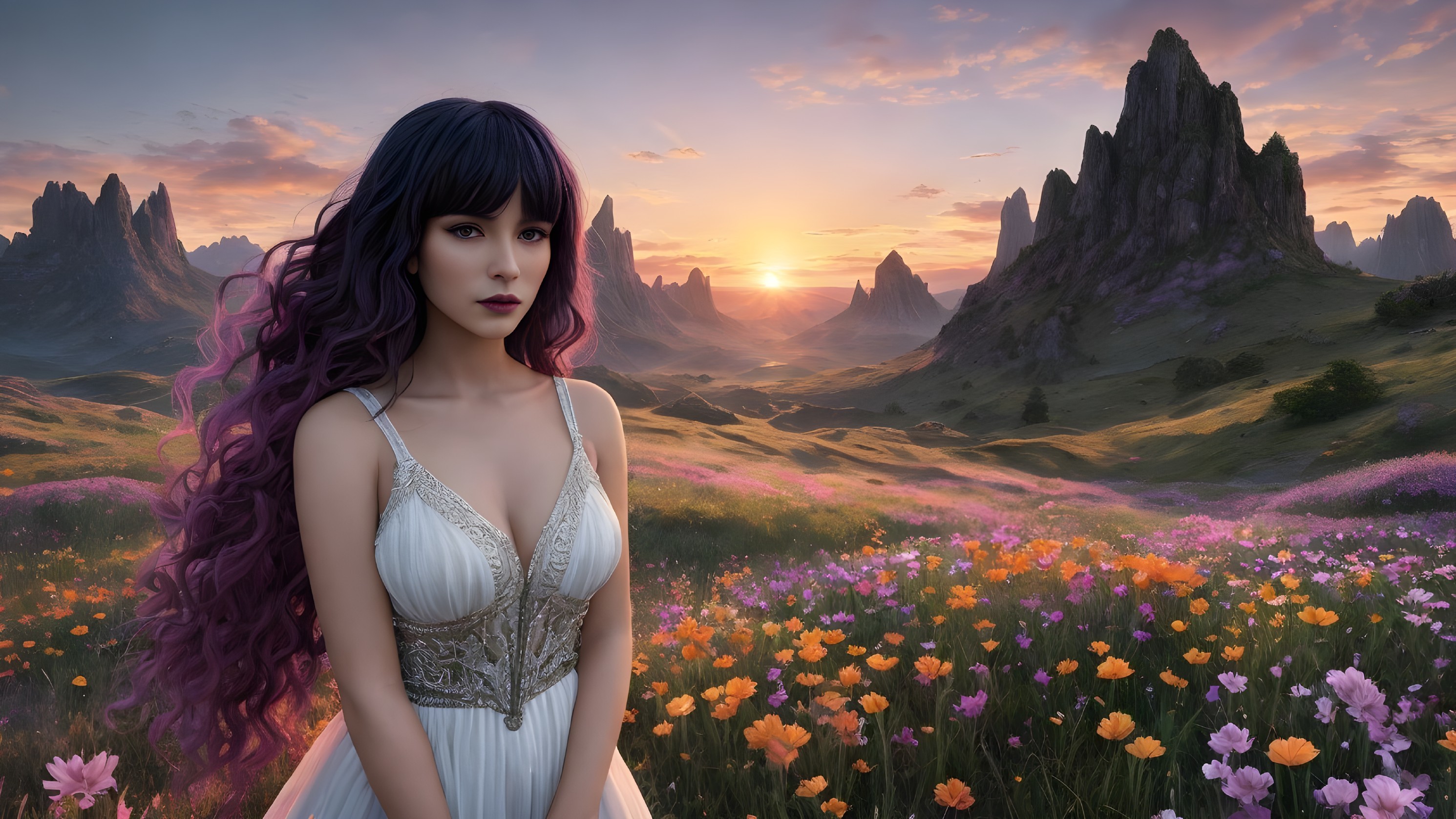 A captivating fantasy scene at sunset showcases a young woman with goth-style hair in a field of vibrant flowers and magic mushrooms. Dramatic mountains rise against a colorful sky, blending beauty and tension.
