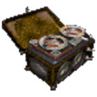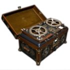 + Prompt:An ornate chest containing a vintage tape recorder, slightly ajar, dominates the center of the frame. The chest is crafted from a dark material, possibly wood, and adorned with metallic details such as rivets and decorative clasps. A vintage tape recorder lies inside the chest. On top of the chest are two round devices, possibly film reels, with intricate patterns that appear metallic and contain hints of a reddish-brown color. The chest is positioned against a dark, undefined background, making it the primary focus. The lighting appears to emanate from an unseen source, illuminating the interior of the chest and highlighting the metallic details of the chest and its accessories. The style leans toward high resolution, suggesting professional vintage photography. The overall mood evokes thoughts of mystery and conspiracy.