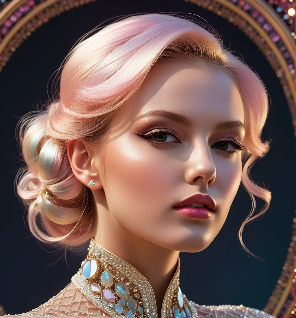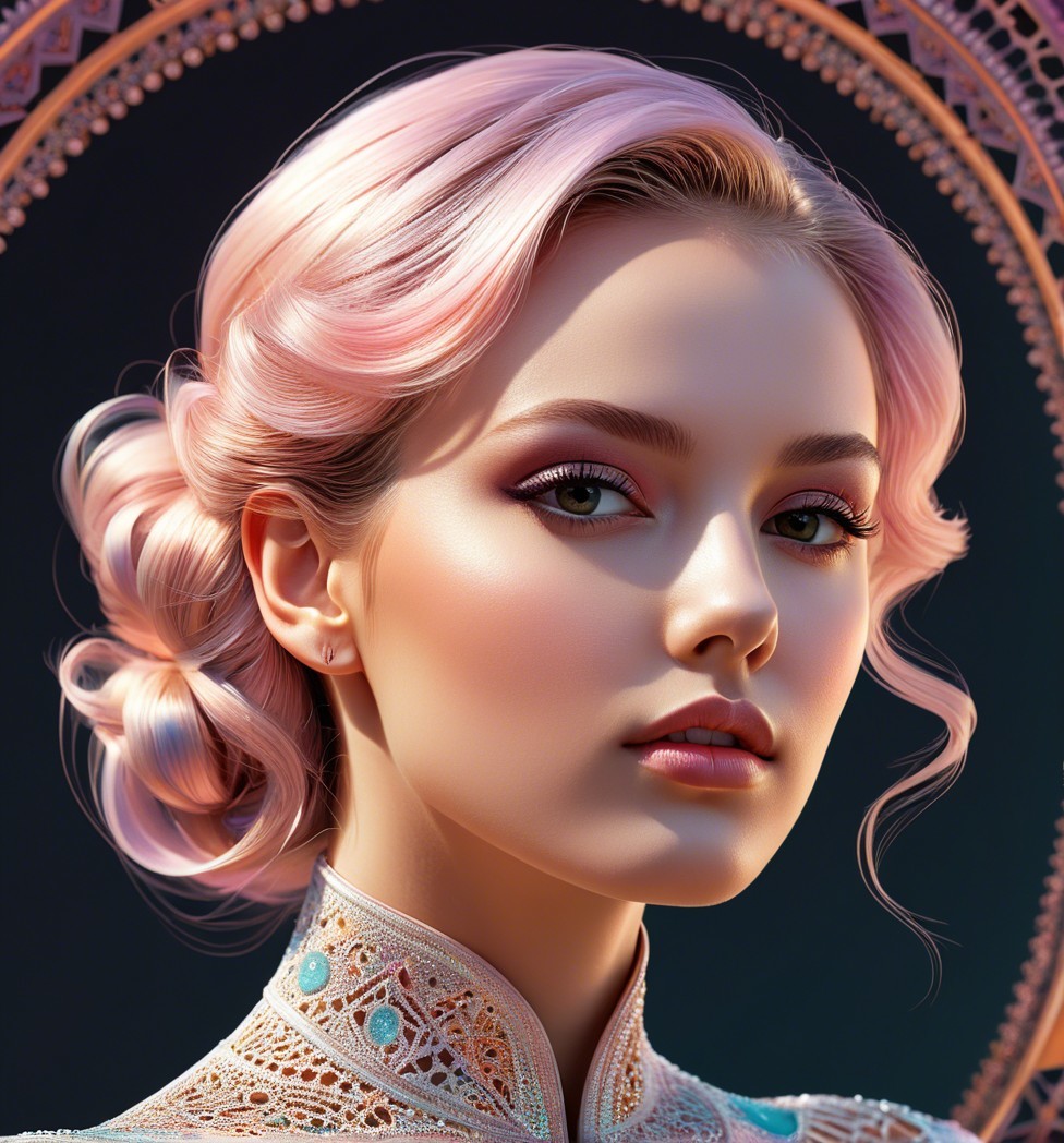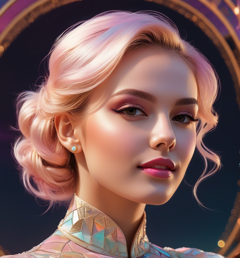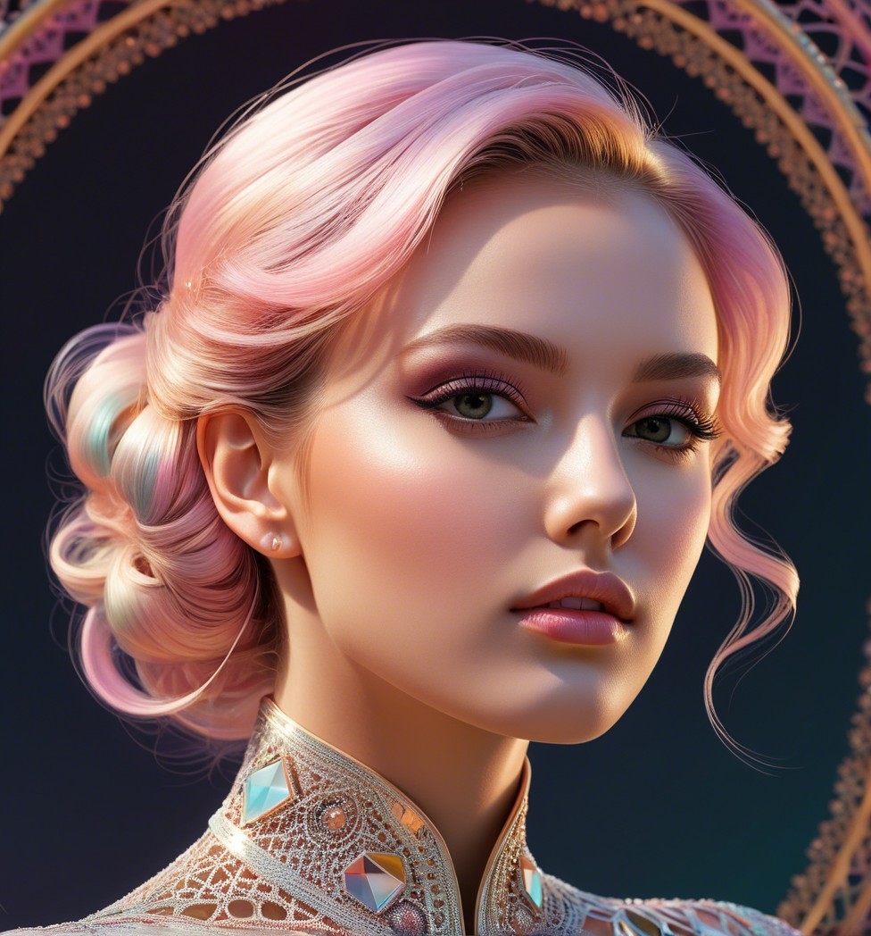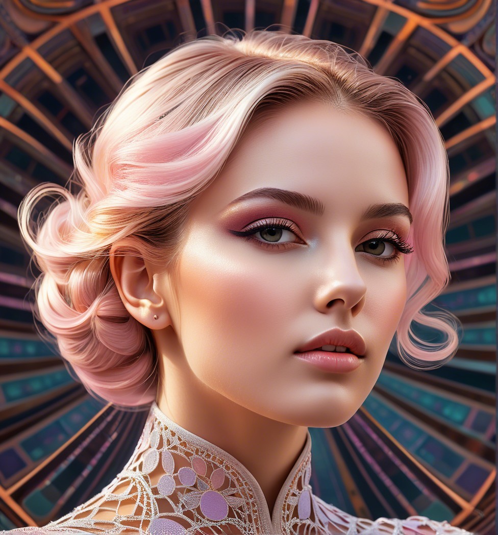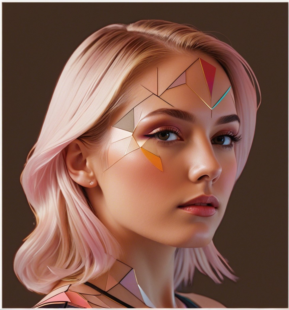 Prompt: Feminine silhouette, angled, female headshot by Eugene Delatre, surreal intricate overlaid geometrical 3D effects, synthwave essence, vivid pastels of ho baron, washed-out clouds in watercolor, sketchy lines, rich textures, dof, debeh, bokeh, stippled, tesselated, golden hour, abstract, structured, confident smirky smile, awesome face, detailed line art to create a whimsical and psychedelic ambiance with hatching details, ethereal atmosphere, geometrical, precise execution, dreamlike color palette with HDR and UHD, visible textures, --ar 1:1 --q 2 --s 750, brightened color palette,dreamlike color palette with HDR and UHD, visible textures, fractals overlay, nacre, sequins, beads, pearls, avant-garde artwork, catenaries, cymatics, vortexes, warm 3 point lighting, digital painting, intricate patterns, asymmetrical details, metallic coloring, highly detailed textures by color palette is a vivid mix of pastel tones,grain, dots, parallax occlusion 1.5, cool hues, seemly, proper, decorous, fitting, stylized, comely, stacked lines, luminostity 1.6, rusticcore, vintage, plasticity 1.4, holographic elements, visible textures, harsh coloring, retro-futuristic foampunk & op-art reminiscence. Illuminated with vibrant and contrasting colors, casted shadows and highlights, great depth and scale, dynamic lighting effects, linework blends fractal shapes by Stan Lee and Ho Baron and William Bradley, rectangles in pale red hues, deep cobalt shades, asymmetrical color gradients, swirls blending colors, dof, bokeh, debeh, radiance, intricate details by Arlie Opal, overall composition by Ed Binkley, geometrical elements with bold lineage, reminiscent of pop art with a 1970s retro design twist, psychedelic color scheme, op-art inspired by Ho Baron. collagraphy with light-orange and pale-brown coloring, great depth and scale, abstract scene, delicate, pale tones, simplistic indiecore style, angled, hues by Ed Binkley, rough paint,