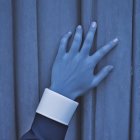 A hand with blue skin displays elegant jewelry, featuring rings with blue stones and a unique charm. The background is a soft blue curtain, enhancing the sophisticated look.