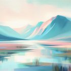 A serene landscape featuring soft, pastel mountains reflected in a calm river. The gentle hues of pink and blue create a tranquil atmosphere, evoking a sense of peace and natural beauty.