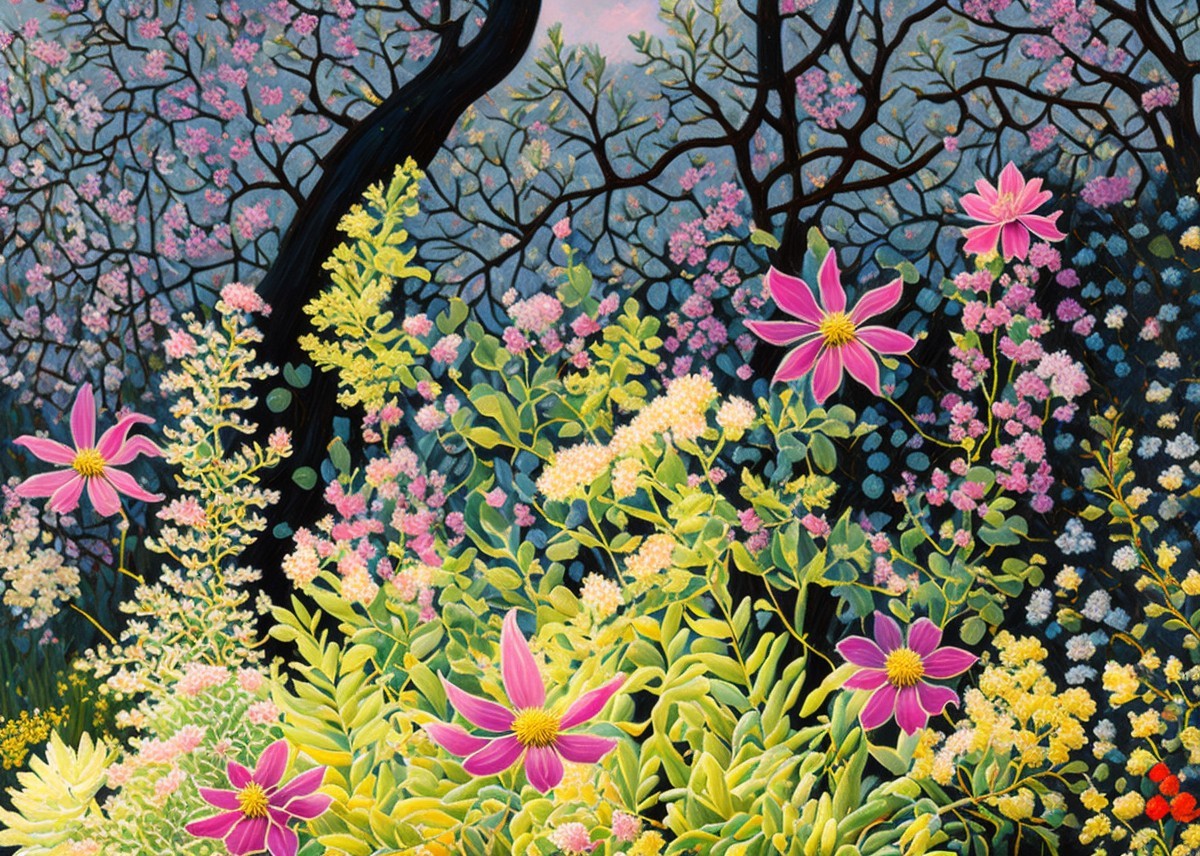 + Prompt:André Bauchant style, textured brushstrokes, thickly applied oil paint. Samphire with light green stems and yellow umbels, flowers with detailed pattern, white, pink, salmon, red, variegated, surrounded by leaves, textured, weathered rock wall in the background