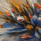 An abstract artwork featuring dynamic swirls of bold colors—blues, oranges, and pinks—intertwined with textured layers, resembling a vibrant floral arrangement in motion.