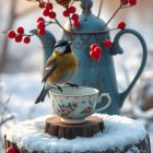 A small bird perches on a floral teacup placed on a rustic wooden log. Nearby, a blue teapot and festive red berries contrast with the snowy setting. Pinecones add to the charming, wintry scene.