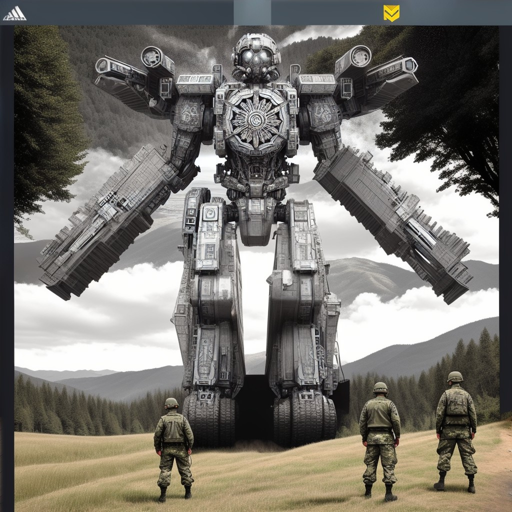 A massive, intricately designed robot towers over two soldiers in a serene forest landscape, blending high-tech elements with a natural backdrop. The scene conveys a mix of awe and tension.