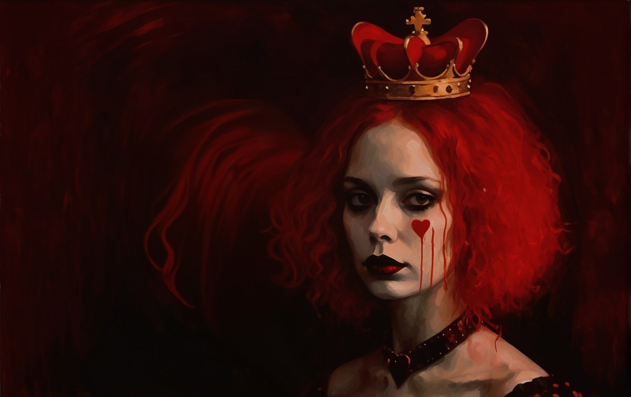 Prompt: portrait, queen of hearts, impasto oil painting, dark, abstract, ominous, style of Dave McKean, Jeremy Mann, Christopher Bucklow and Stephen Gammell
