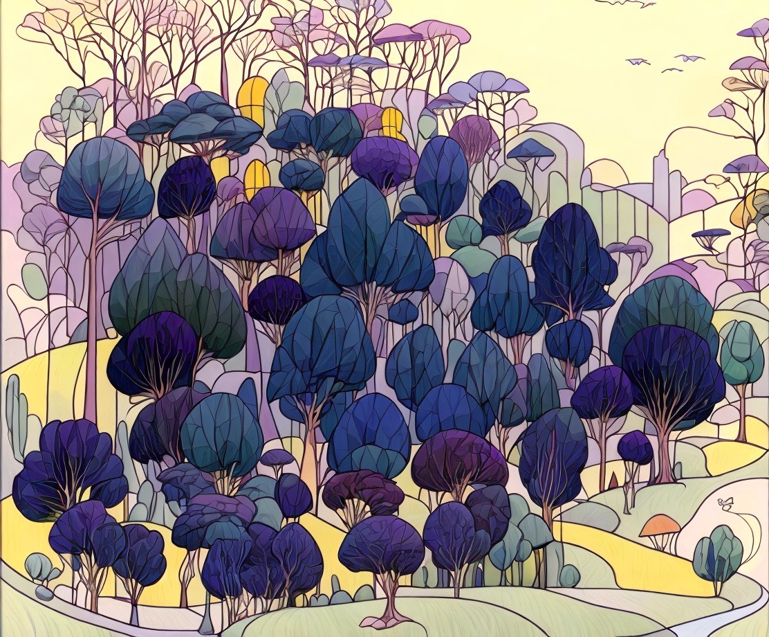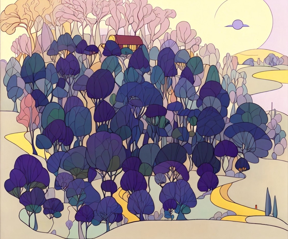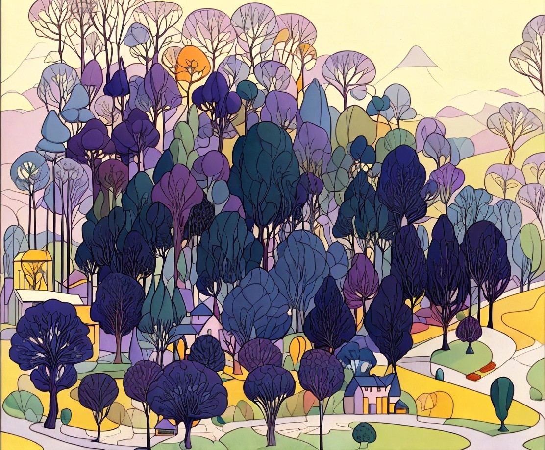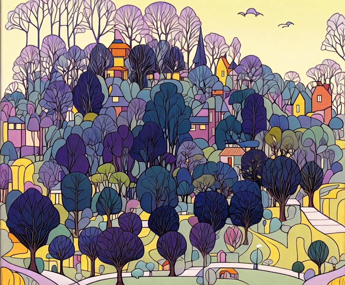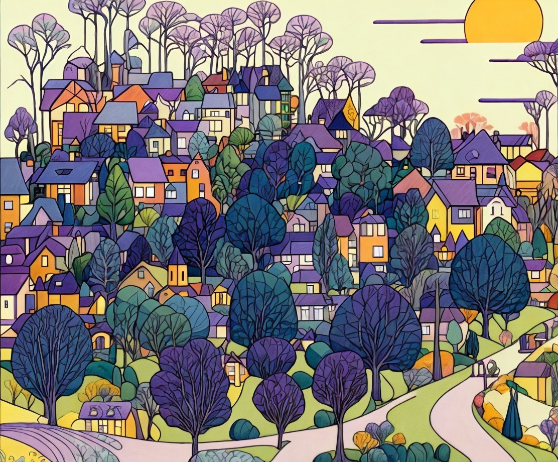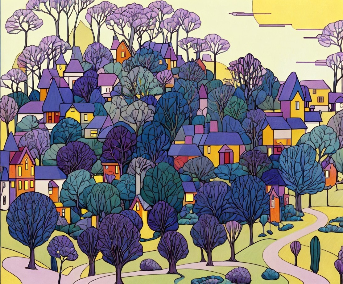 A colorful, stylized artwork featuring a village with houses amidst trees under a yellow sun.