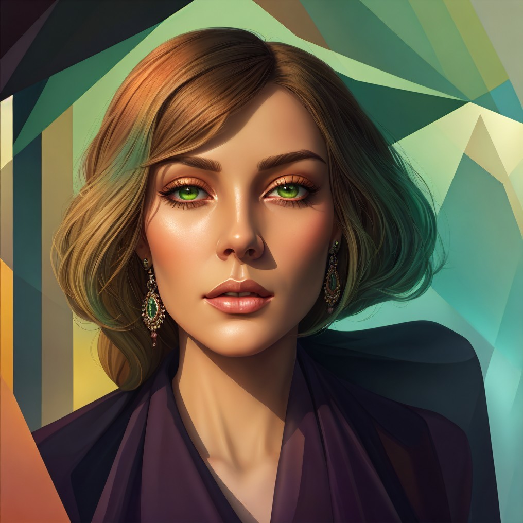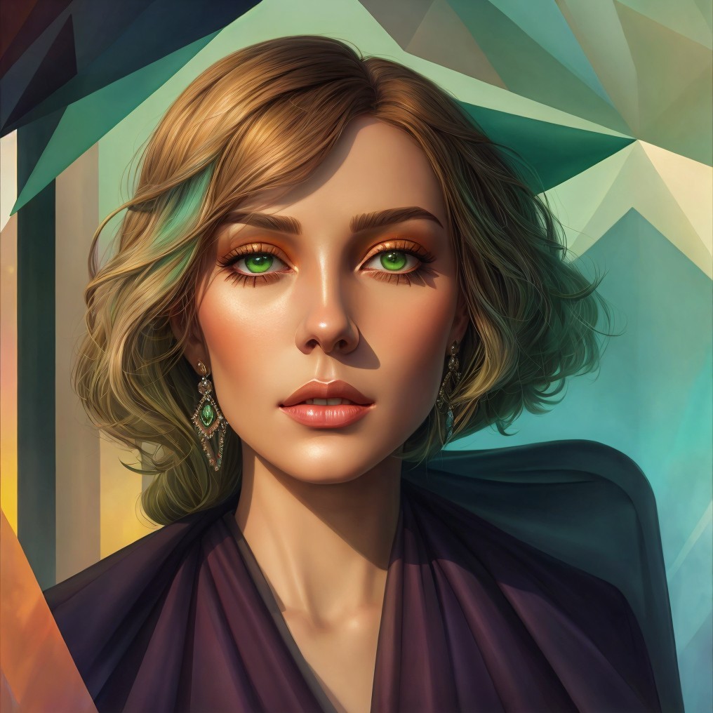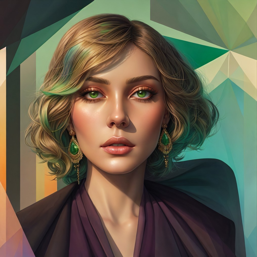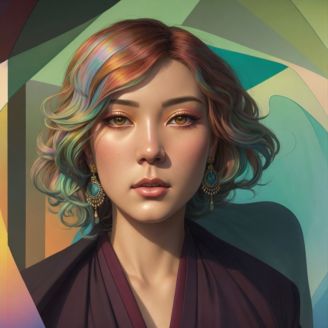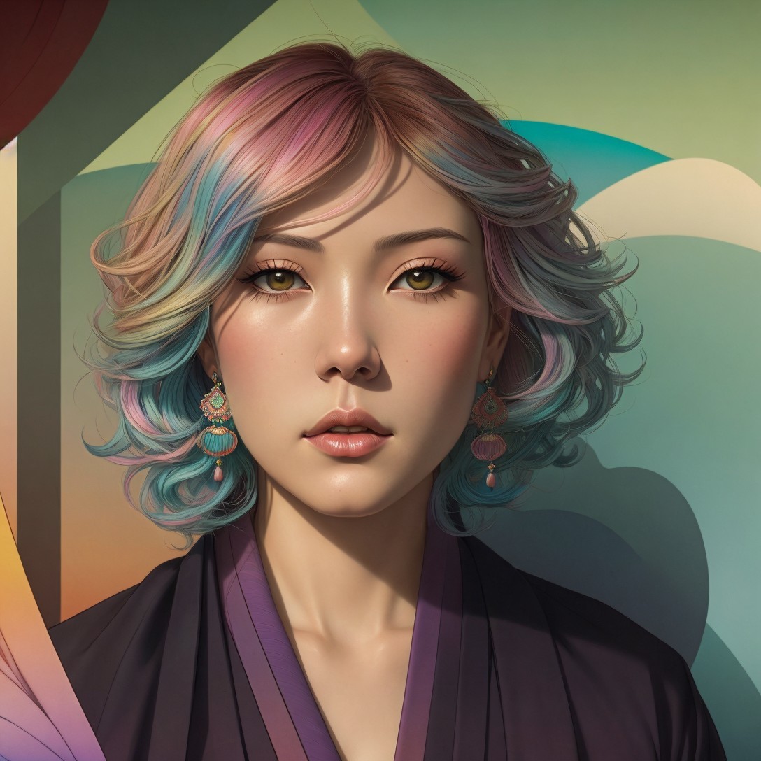 A digital portrait of a woman with pastel-colored hair, wearing earrings and a dark outfit, with soft lighting and geometric shapes in the background.