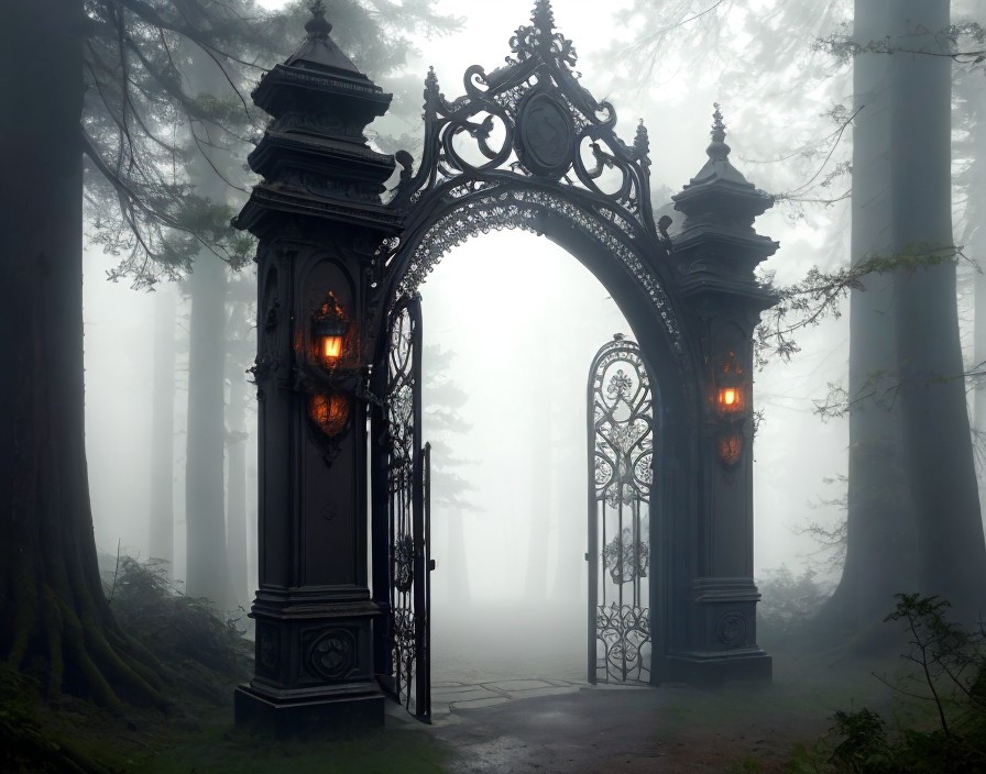 An ornate, open gate stands amidst a foggy, tree-lined path, invoking a sense of mystery and enchantment.