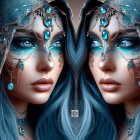 The image features a striking close-up of a model with vibrant blue makeup, sparkling embellishments, and dramatic eyelashes, exuding a captivating allure with intricate details and a glossy finish.