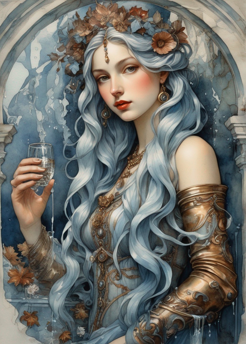 soft watercolor extra water in Art Deco by Annigoni, Egon Schiele, Milo Manara, Botticelli, Catrin Welz-Stein, Jean Metzinger, Klimt, perfect eyes, perfect handsface, highly detailed, complementary colors, hyper detailed. Watercolor and ink splatter, dynamic pose, dark blue background, unreal engine, greg rutkowski, loish, rhads, beeple, makoto shinkai and lois van baarle, ilya kuvshinov, rossdraws, tom bagshaw, alphonse mucha, global illumination, detailed and intricate environment