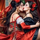 The image features two women posing in elegant lingerie. One wears a black ensemble with a sheer robe, while the other is dressed in a striking red robe, both exuding confidence and style.