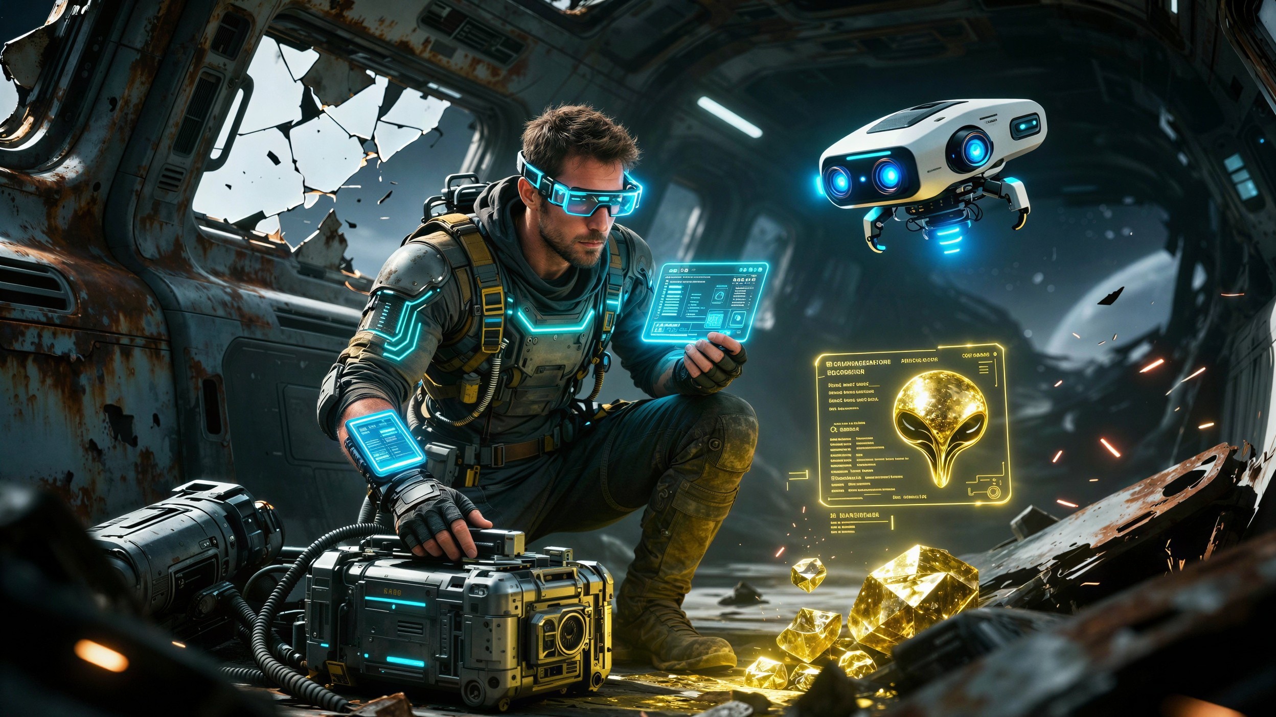 Prompt: a male rpg character. an explorer or field researcher, equally at home in the laboratory or wilderness. salvaging equipment fron a derilict ship in uncharted space. he has lots of advanced gadgets and an intelligent drone. he wears sci fi compute gear and goggles. holograms highlight valuable materials.