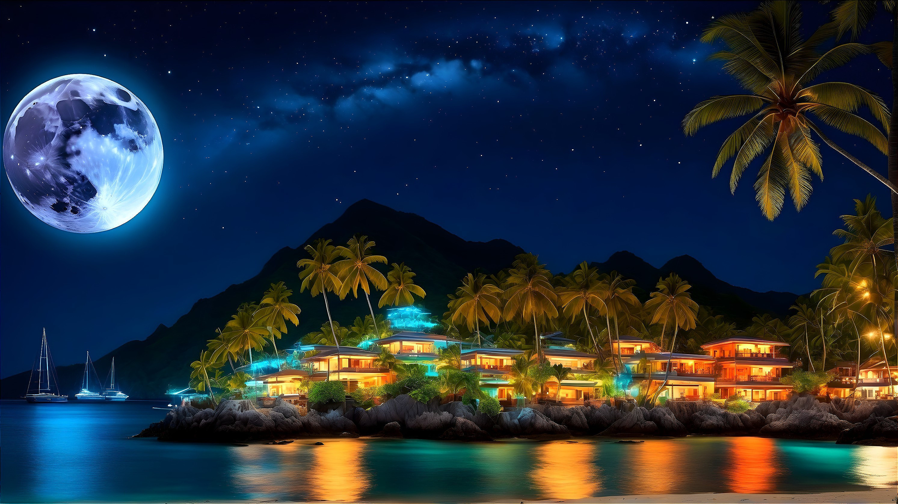 An island town surrounded by mountain range, at midnight the town is illuminated by a huge azure colored moon, the Milky Way is glowing in the sky, divers dive from a yachts, coconut palms are beautifully planted along the beach