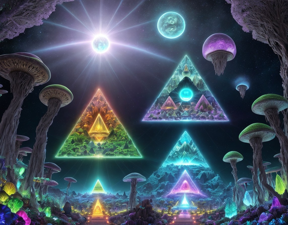 Extraterrestrial menagerie pyramid intertwined with advanced alien technology in a surreal cosmic landscape with mushrooms, and waterfalls. pyramid with the sun and moon, astral projection, UFO in front of bioluminescent mushrooms and colossal crystals. Picture a time-traveling alchemist surrounded by symbols like sacred geometry, mystical occult imagery (hamsa, eye of providence), talismans, esoteric tarot cards, and the all-seeing eye. Realistic and natural elements, under a cosmic sky. alien plants, psychedelic elements like galactic DMT entities, hallucinogenic vibes, shamanic horror LSD art, and the ethereal DMT realm. In the style of Cameron Gray