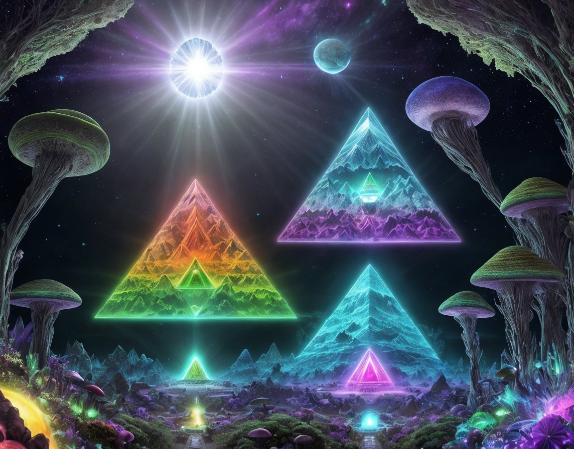 + Prompt:Extraterrestrial menagerie pyramid intertwined with advanced alien technology in a surreal cosmic landscape with mushrooms, and waterfalls. pyramid with the sun and moon, astral projection, UFO in front of bioluminescent mushrooms and colossal crystals. Picture a time-traveling alchemist surrounded by symbols like sacred geometry, mystical occult imagery (hamsa, eye of providence), talismans, esoteric tarot cards, and the all-seeing eye. Realistic and natural elements, under a cosmic sky. alien plants, psychedelic elements like galactic DMT entities, hallucinogenic vibes, shamanic horror LSD art, and the ethereal DMT realm. In the style of Cameron Gray