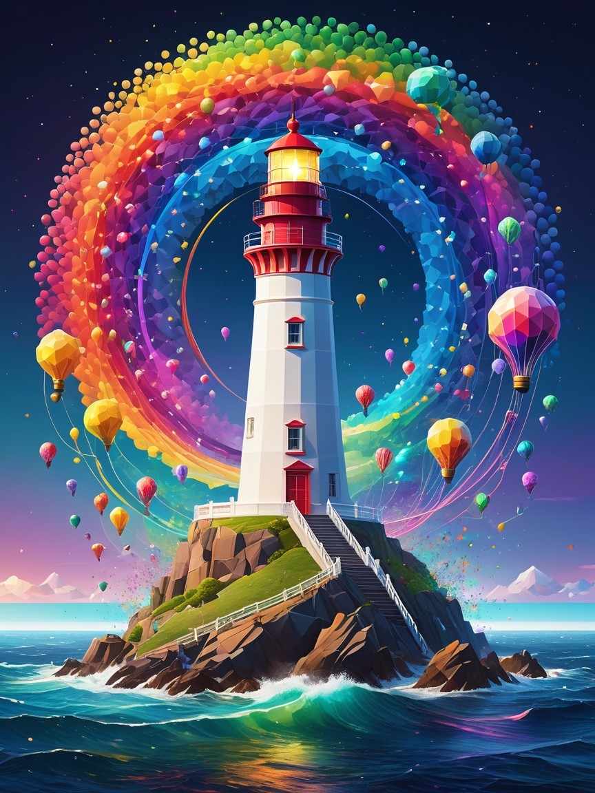 A vibrant lighthouse stands atop a rocky island, surrounded by colorful hot air balloons and a dazzling rainbow halo, all set against a magical ocean backdrop and a starry sky.
