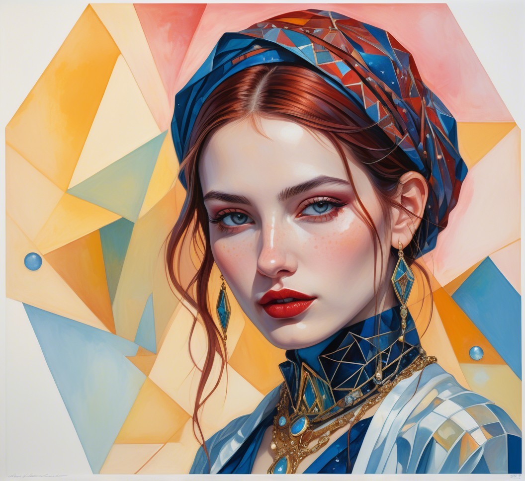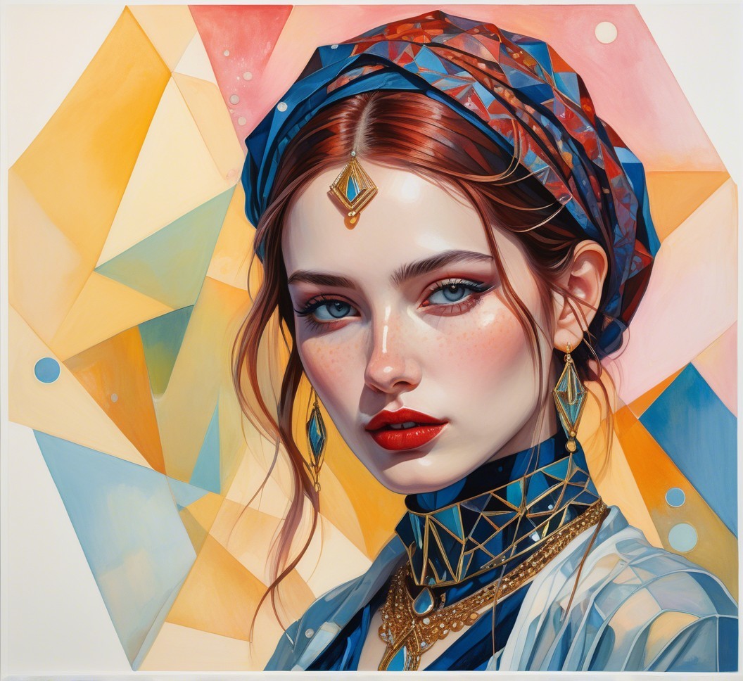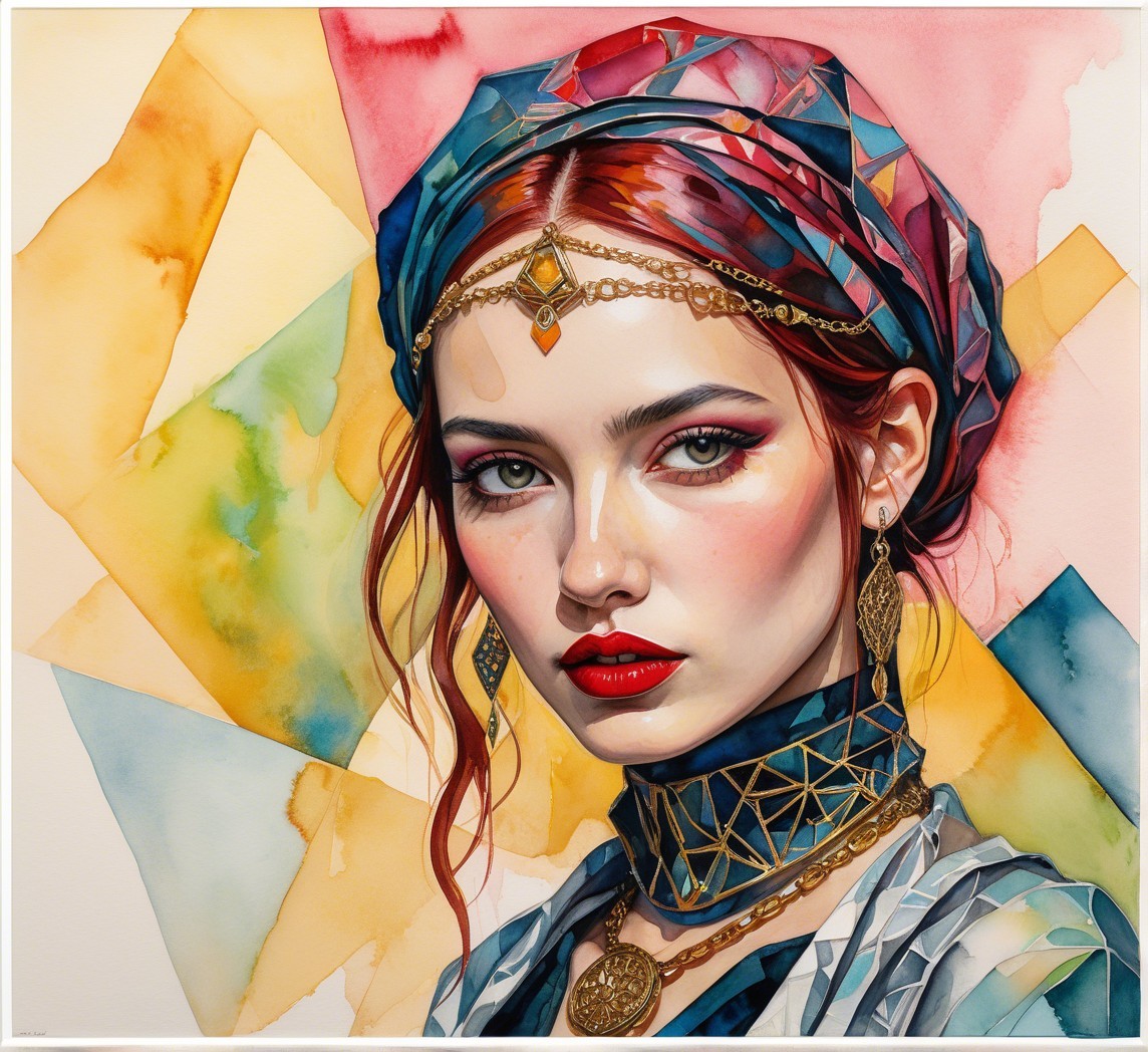 A captivating portrait of a young woman with striking blue eyes and flowing red hair, adorned with elegant jewelry and a geometric-patterned headscarf, set against a vibrant, abstract background.