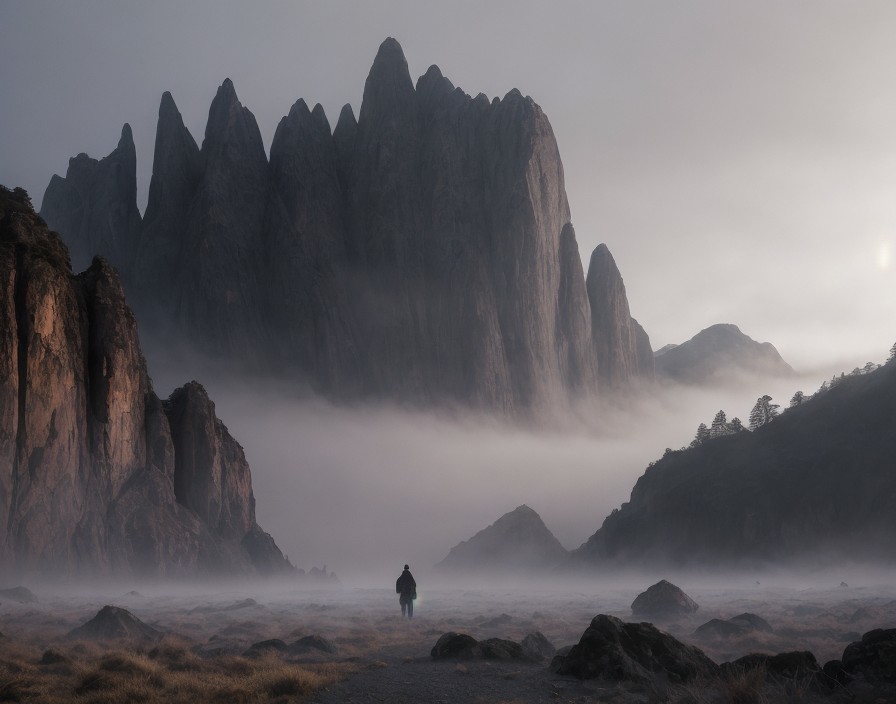 A misty landscape reveals towering jagged mountains, shrouded in fog. A lone figure stands amidst the ethereal scenery, creating a sense of solitude and the vastness of nature's beauty.