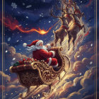 Santa Claus joyfully rides in a lavish sleigh, pulled by reindeer, against a starry night sky. His cheerful expression and flowing red robe capture the spirit of holiday magic.