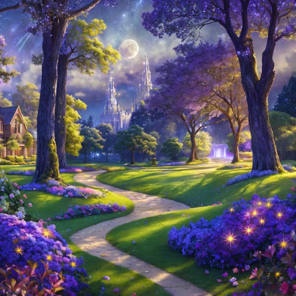 A magical moonlit garden with blooming trees, purple flowers, winding paths, and twinkling stars scattered above.
